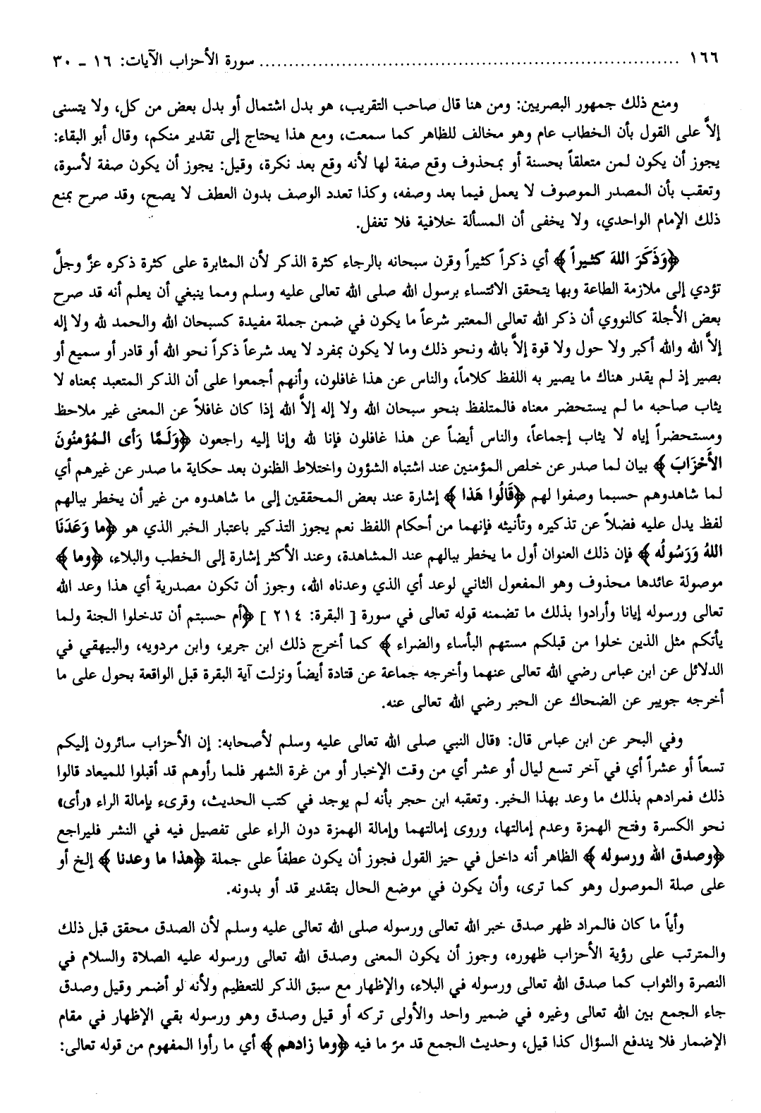 وَذَكَرَ اللَّهَ كَثِيراً أي ذكرا كثيرا وقرن سبحانه بالرجاء كثرة الذكر لأن المثابرة على كثرة ذكره عزّ وجلّ تؤدي إلى ملازمة الطاعة وبها يتحقق الائتساء برسول الله صلّى الله تعالى عليه وسلم ومما ينبغي أن يعلم أنه قد صرح بعض الأجلة كالنووي أن ذكر الله تعالى المعتبر شرعا ما يكون في ضمن جملة مفيدة كسبحان الله والحمد لله ولا إله إلّا الله والله أكبر ولا حول ولا قوة إلّا بالله ونحو ذلك وما لا يكون بمفرد لا يعد شرعا ذكرا نحو الله أو قادر أو سميع أو بصير إذ لم يقدر هناك ما يصير به اللفظ كلاما، والناس عن هذا غافلون، وأنهم أجمعوا على أن الذكر المتعبد بمعناه لا يثاب صاحبه ما لم يستحضر معناه فالمتلفظ بنحو سبحان الله ولا إله إلّا الله إذا كان غافلا عن المعنى غير ملاحظ ومستحضرا إياه لا يثاب إجماعا، والناس أيضا عن هذا غافلون فإنا لله وإنا إليه راجعون وَلَمَّا رَأَ الْمُؤْمِنُونَ الْأَحْزابَ بيان لما صدر عن خلص المؤمنين عند اشتباه الشؤون واختلاط الظنون بعد حكاية ما صدر عن غيرهم أي لما شاهدوهم حسبما وصفوا لهم قالُوا هذا إشارة عند بعض المحققين إلى ما شاهدوه من غير أن يخطر ببالهم لفظ يدل عليه فضلا عن تذكيره وتأنيثه فإنهما من أحكام اللفظ نعم يجوز التذكير باعتبار الخبر الذي هو ما وَعَدَنَا اللَّهُ وَرَسُولُهُ فإن ذلك العنوان أول ما يخطر ببالهم عند المشاهدة، وعند الأكثر إشارة إلى الخطب والبلاء، وما موصولة عائدها محذوف وهو المفعول الثاني لوعد أي الذي وعدناه الله، وجوز أن تكون مصدرية أي هذا وعد الله تعالى ورسوله إيانا وأرادوا بذلك ما تضمنه قوله تعالى في سورة [البقرة: 214] أَمْ حَسِبْتُمْ أَنْ تَدْخُلُوا الْجَنَّةَ وَلَمَّا يَأْتِكُمْ مَثَلُ الَّذِينَ خَلَوْا مِنْ قَبْلِكُمْ مَسَّتْهُمُ الْبَأْساءُ وَالضَّرَّاءُ كما أخرج ذلك ابن جرير، وابن مردويه، والبيهقي في الدلائل عن ابن عباس رضي الله تعالى عنهما وأخرجه جماعة عن قتادة أيضا ونزلت آية البقرة قبل الواقعة بحول على ما أخرجه جويبر عن الضحاك عن الحبر رضي الله تعالى عنه.