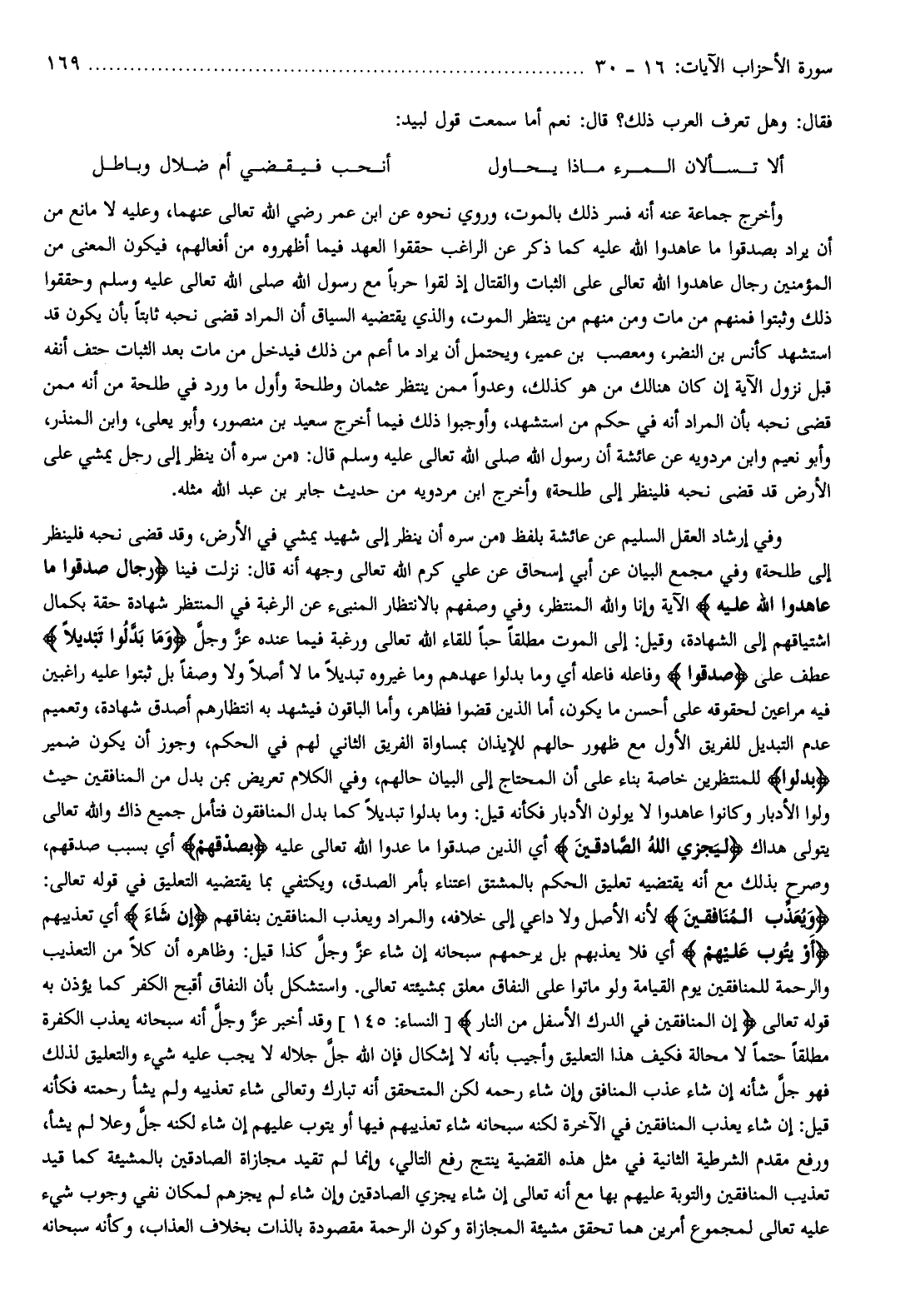 ، وفي وصفهم بالانتظار المنبئ عن الرغبة في المنتظر شهادة حقة بكمال اشتياقهم إلى الشهادة، وقيل: إلى الموت مطلقا حبا للقاء الله تعالى ورغبة فيما عنده عزّ وجلّ وَما بَدَّلُوا تَبْدِيلًا عطف على صَدَقُوا وفاعله فاعله أي وما بدلوا عهدهم وما غيروه تبديلا ما لا أصلا ولا وصفا بل ثبتوا عليه راغبين فيه مراعين لحقوقه على أحسن ما يكون، أما الذين قضوا فظاهر، وأما الباقون فيشهد به انتظارهم أصدق شهادة، وتعميم عدم التبديل للفريق الأول مع ظهور حالهم للإيذان بمساواة الفريق الثاني لهم في الحكم، وجوز أن يكون ضمير بَدَّلُوا للمنتظرين خاصة بناء على أن المحتاج إلى البيان حالهم، وفي الكلام تعريض بمن بدل من المنافقين حيث ولوا الأدبار وكانوا عاهدوا لا يولون الأدبار فكأنه قيل: وما بدلوا تبديلا كما بدل المنافقون فتأمل جميع ذاك والله تعالى يتولى هداك لِيَجْزِيَ اللَّهُ الصَّادِقِينَ أي الذين صدقوا ما عدوا الله تعالى عليه بِصِدْقِهِمْ أي بسبب صدقهم، وصرح بذلك مع أنه يقتضيه تعليق الحكم بالمشتق اعتناء بأمر الصدق، ويكتفي بما يقتضيه التعليق في قوله تعالى: