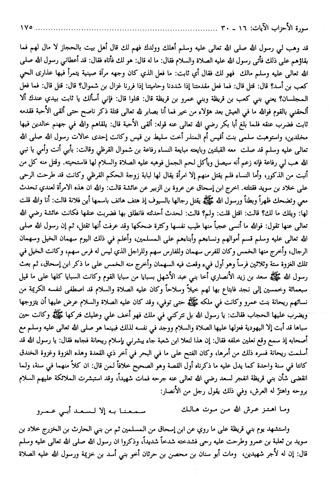 قد وهب لي رسول الله صلّى الله تعالى عليه وسلم أهلك وولدك فهم لك قال أهل بيت بالحجاز لا مال لهم فما بقاؤهم على ذلك فأتى رسول الله عليه الصلاة والسلام فقال: ما له قال: هو لك فأتاه فقال: قد أعطاني رسول الله صلّى الله تعالى عليه وسلم مالك فهو لك فقال أي ثابت: ما فعل الذي كان وجهه مرآة صينية يتمرأ فيها عذارى الحي كعب بن أسد؟ قال: قتل قال: فما فعل مقدمتنا إذا شددنا وحاميتنا إذا فررنا غزال بن شموال؟ قال: قتل قال: فما فعل المجلسان؟ يعني بني كعب بن قريظة وبني عمرو بن قريظة قال: قتلوا قال: فإني أسألك يا ثابت بيدي عندك ألا ألحقني بالقوم فو الله ما في العيش بعد هؤلاء من خير فما أنا بصابر لله تعالى قتلة ذكر ناصح حتى ألقى الأحبة فقدمه ثابت فضرب عنقه فلما بلغ أبا بكر رضي الله تعالى عنه قوله: ألقى الأحبة قال: يلقاهم والله في جهنم خالدين فيها مخلدين، واستوهبت سلمى بنت أقيس أم المنذر أخت سليط بن قيس وكانت إحدى خالات رسول الله صلّى الله تعالى عليه وسلم قد صلت معه القبلتين وبايعته مبايعة النساء رفاعة بن شموال القرظي وقالت: بأبي أنت وأمي يا نبي الله هب لي رفاعة فإنه زعم أنه سيصل ويأكل لحم الجمل فوهبه عليه الصلاة والسلام لها فاستحيته. وقتل منه كل من أنبت من الذكور، وأما النساء فلم يقتل منهم إلا امرأة يقال لها لبابة زوجة الحكم القرظي وكانت قد طرحت الرحى على خلاد بن سويد فقتلته. اخرج ابن إسحاق عن عروة بن الزبير عن عائشة قالت: والله ان هذه الامرأة لعندي تحدث معي وتضحك ظهرا وبطنا ورسول الله صلّى الله عليه وسلم يقتل رجالها بالسيوف إذ هتف هاتف باسمها أين فلانة قالت: أنا والله قلت لها: ويلك ما لك؟ قالت: اقتل قلت: ولم؟ قالت: لحدث أحدثته فانطلق بها فضربت عنقها فكانت عائشة رضي الله تعالى عنها تقول: فو الله ما أنسى عجبا منها طيب نفسها وكثرة ضحكها وقد عرفت أنها تقتل، ثم إن رسول الله صلّى الله تعالى عليه وسلم قسم أموالهم ونساءهم وأبناءهم على المسلمين، وأعلم في ذلك اليوم سهمان الخيل وسهمان الرجال، وأخرج منها الخمس وكان للفرس سهمان وللفارس سهم وللراجل الذي ليس له فرس سهم، وكانت الخيل في تلك الغزوة ستة وثلاثين فرسا وهو أول فيء وقعت فيه السهمان وأخرج منه الخمس على ما ذكر ابن إسحاق، ثم بعث رسول الله صلّى الله عليه وسلم سعد بن زيد الأنصاري أخا بني عبد الأشهل بسبايا من سبايا القوم وكانت السبايا كلها على ما قيل سبعمائة وخمسين إلى نجد فابتاع بها لهم خيلا وسلاحا وكان عليه الصلاة والسلام قد اصطفى لنفسه الكريمة من نسائهم ريحانة بنت عمرو وكانت في ملكه صلّى الله عليه وسلم حتى توفي، وقد كان عليه الصلاة والسلام عرض عليها أن يتزوجها ويضرب عليها الحجاب فقالت: يا رسول الله بل تتركني في ملك فهو أخف علي وعليك فتركها صلّى الله عليه وسلم وكانت حين سباها قد أبت إلا اليهودية فعزلها عليه الصلاة والسلام ووجد في نفسه لذلك فبينما هو صلّى الله تعالى عليه وسلم مع أصحابه إذ سمع وقع نعلين خلفه فقال: إن هذا لنعلا ابن شعبة جاء يبشرني بإسلام ريحانة فجاءه فقال: يا رسول الله قد أسلمت ريحانة فسره ذلك من أمرها