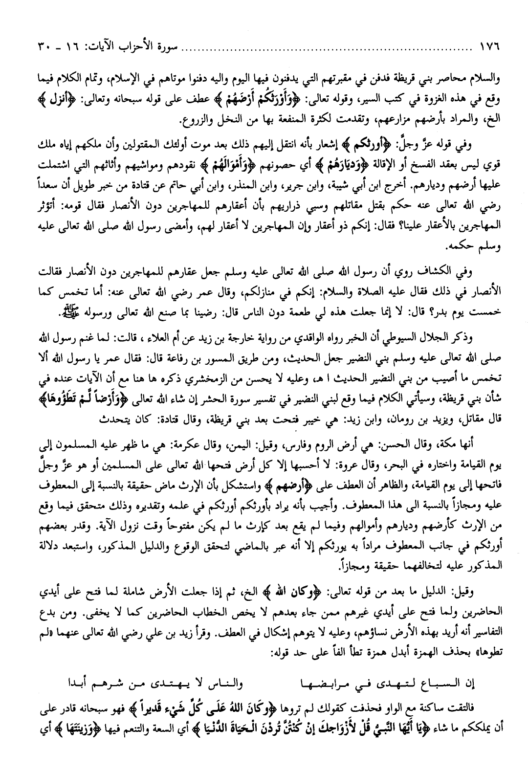 والسلام محاصر بني قريظة فدفن في مقبرتهم التي يدفنون فيها اليوم واليه دفنوا موتاهم في الإسلام، وتمام الكلام فيما وقع في هذه الغزوة في كتب السير، وقوله تعالى: وَأَوْرَثَكُمْ أَرْضَهُمْ عطف على قوله سبحانه وتعالى: أَنْزَلَ إلخ، والمراد بأرضهم مزارعهم، وتقدمت لكثرة المنفعة بها من النخل والزروع.