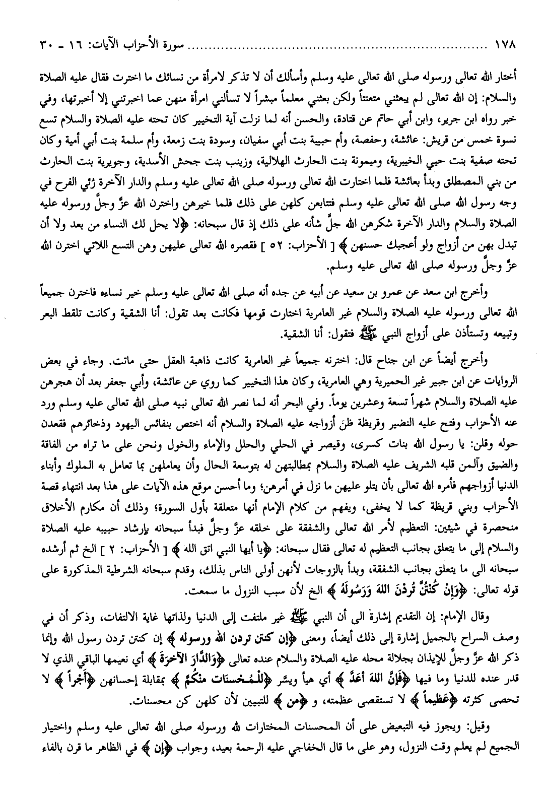 وفي خبر رواه ابن جرير، وابن أبي حاتم عن قتادة، والحسن أنه لما نزلت آية التخيير كان تحته عليه الصلاة والسلام تسع نسوة خمس من قريش: عائشة، وحفصة، وأم حبيبة بنت أبي سفيان، وسودة بنت زمعة، وأم سلمة بنت أبي أمية وكان تحته صفية بنت حيي الخيبرية، وميمونة بنت الحارث الهلالية، وزينب بنت جحش الأسدية، وجويرية بنت الحارث من بني المصطلق وبدأ بعائشة فلما اختارت الله تعالى ورسوله صلّى الله تعالى عليه وسلم والدار الآخرة رئي الفرح في وجه رسول الله صلّى الله تعالى عليه وسلم فتتابعن كلهن على ذلك فلما خيرهن واخترن الله عزّ وجلّ ورسوله عليه الصلاة والسلام والدار الآخرة شكرهن الله جلّ شأنه على ذلك إذ قال سبحانه: لا يَحِلُّ لَكَ النِّساءُ مِنْ بَعْدُ وَلا أَنْ تَبَدَّلَ بِهِنَّ مِنْ أَزْواجٍ وَلَوْ أَعْجَبَكَ حُسْنُهُنَّ [الأحزاب: 52] فقصره الله تعالى عليهن وهن التسع اللاتي اخترن الله عزّ وجلّ ورسوله صلّى الله تعالى عليه وسلم.