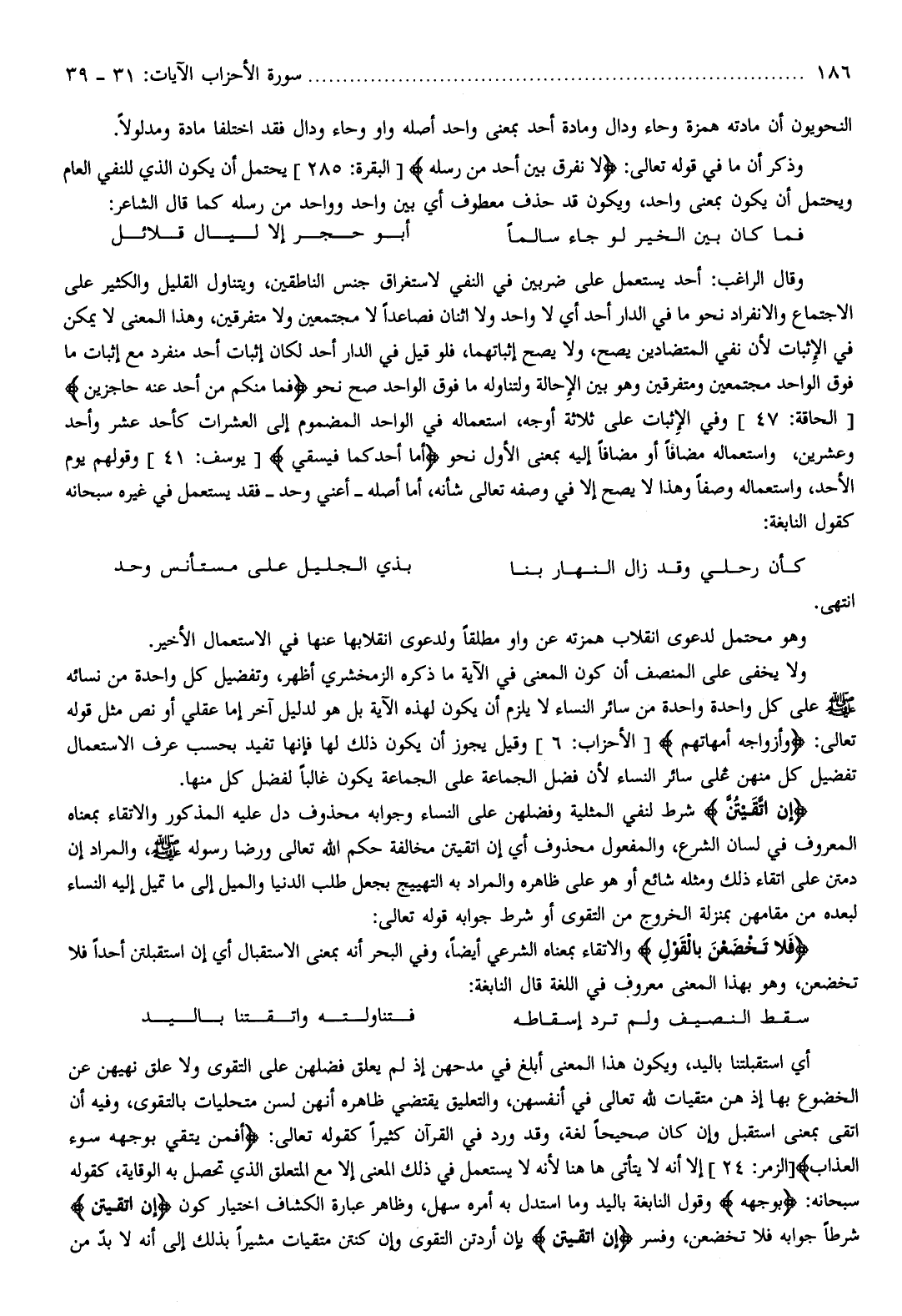 أي استقبلتنا باليد، ويكون هذا المعنى أبلغ في مدحهن إذ لم يعلق فضلهن على التقوى ولا علق نهيهن عن الخضوع بها إذ هن متقيات لله تعالى في أنفسهن، والتعليق يقتضي ظاهره أنهن لسن متحليات بالتقوى، وفيه أن اتقى بمعنى استقبل وإن كان صحيحا لغة، وقد ورد في القرآن كثيرا كقوله تعالى: أَفَمَنْ يَتَّقِي بِوَجْهِهِ سُوءَ الْعَذابِ [الزمر: 24] إلا أنه لا يتأتى هاهنا لأنه لا يستعمل في ذلك المعنى إلا مع المتعلق الذي تحصل به الوقاية، كقوله سبحانه: بِوَجْهِهِ وقول النابغة باليد وما استدل به أمره سهل، وظاهر عبارة الكشاف اختيار كون إِنِ اتَّقَيْتُنَّ شرطا جوابه فلا تخضعن، وفسر إِنِ اتَّقَيْتُنَّ بإن أردتن التقوى وإن كنتن متقيات مشيرا بذلك إلى أنه لا بدّ من