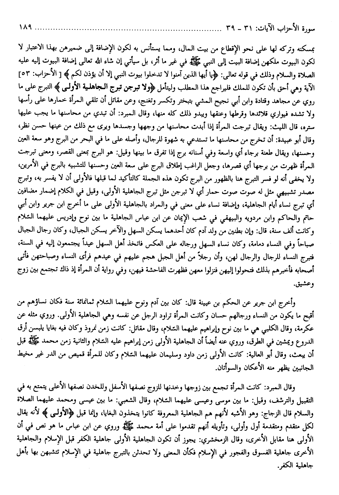 بمسكنه وتركه لها على نحو الإقطاع من بيت المال، ومما يستأنس به لكون الإضافة إلى ضميرهن بهذا الاعتبار لا لكون البيوت ملكهن إضافة البيت إلى النبي صلّى الله عليه وسلم في غير ما أثر، بل سيأتي إن شاء الله تعالى إضافة البيوت إليه عليه الصلاة والسلام وذلك في قوله تعالى: يا أَيُّهَا الَّذِينَ آمَنُوا لا تَدْخُلُوا بُيُوتَ النَّبِيِّ إِلَّا أَنْ يُؤْذَنَ لَكُمْ [الأحزاب: 53] الآية وهي أحق بأن تكون للملك فليراجع هذا المطلب وليتأمل وَلا تَبَرَّجْنَ تَبَرُّجَ الْجاهِلِيَّةِ الْأُولى التبرج على ما روي عن مجاهد وقتادة وابن أبي نجيح المشي بتبختر وتكسر وتغنج، وعن مقاتل أن تلقي المرأة خمارها على رأسها ولا تشده فيواري قلائدها وقرطها وعنقها ويبدو ذلك كله منها، وقال المبرد: أن تبدي من محاسنها ما يجب عليها ستره، قال الليث: ويقال تبرجت المرأة إذا أبدت محاسنها من وجهها وجسدها ويرى مع ذلك من عينها حسن نظر، وقال أبو عبيدة: أن تخرج من محاسنها ما تستدعي به شهوة للرجال، وأصله على ما في البحر من البرج وهو سعة العين وحسنها، ويقال طعنة برجاء أي واسعة وفي أسنانه برج إذا تفرق ما بينها وقيل: هو البرج بمعنى القصر، ومعنى تبرجت المرأة ظهرت من برجها أي قصرها، وجعل الراغب إطلاق البرج على سعة العين وحسنها للتشبيه بالبرج في الأمرين، ولا يخفى أنه لو فسر التبرج هنا بالظهور من البرج تكون هذه الجملة كالتأكيد لما قبلها فالأولى أن لا يفسر به، وتبرج مصدر تشبيهي مثل له صوت صوت حمار أي لا تبرجن مثل تبرج الجاهلية الأولى، وقيل في الكلام إضمار مضافين أي تبرج نساء أيام الجاهلية، وإضافة نساء على معنى في والمراد بالجاهلية الأولى على ما أخرج ابن جرير وابن أبي حاتم والحاكم وابن مردويه والبيهقي في شعب الإيمان عن ابن عباس الجاهلية ما بين نوح وإدريس عليهما السّلام وكانت ألف سنة، قال: وإن بطنين من ولد آدم كان أحدهما يسكن السهل والآخر يسكن الجبال، وكان رجال الجبال صباحا وفي النساء دمامة، وكان نساء السهل ورجاله على العكس فاتخذ أهل السهل عيدا يجتمعون إليه في السنة، فتبرج النساء للرجال والرجال لهن، وأن رجلا من أهل الجبل هجم عليهم في عيدهم فرأى النساء وصباحتهن فأتى أصحابه فأخبرهم بذلك فتحولوا إليهن فنزلوا معهن فظهرت الفاحشة فيهن، وفي رواية أن المرأة إذ ذاك تجتمع بين زوج وعشيق.