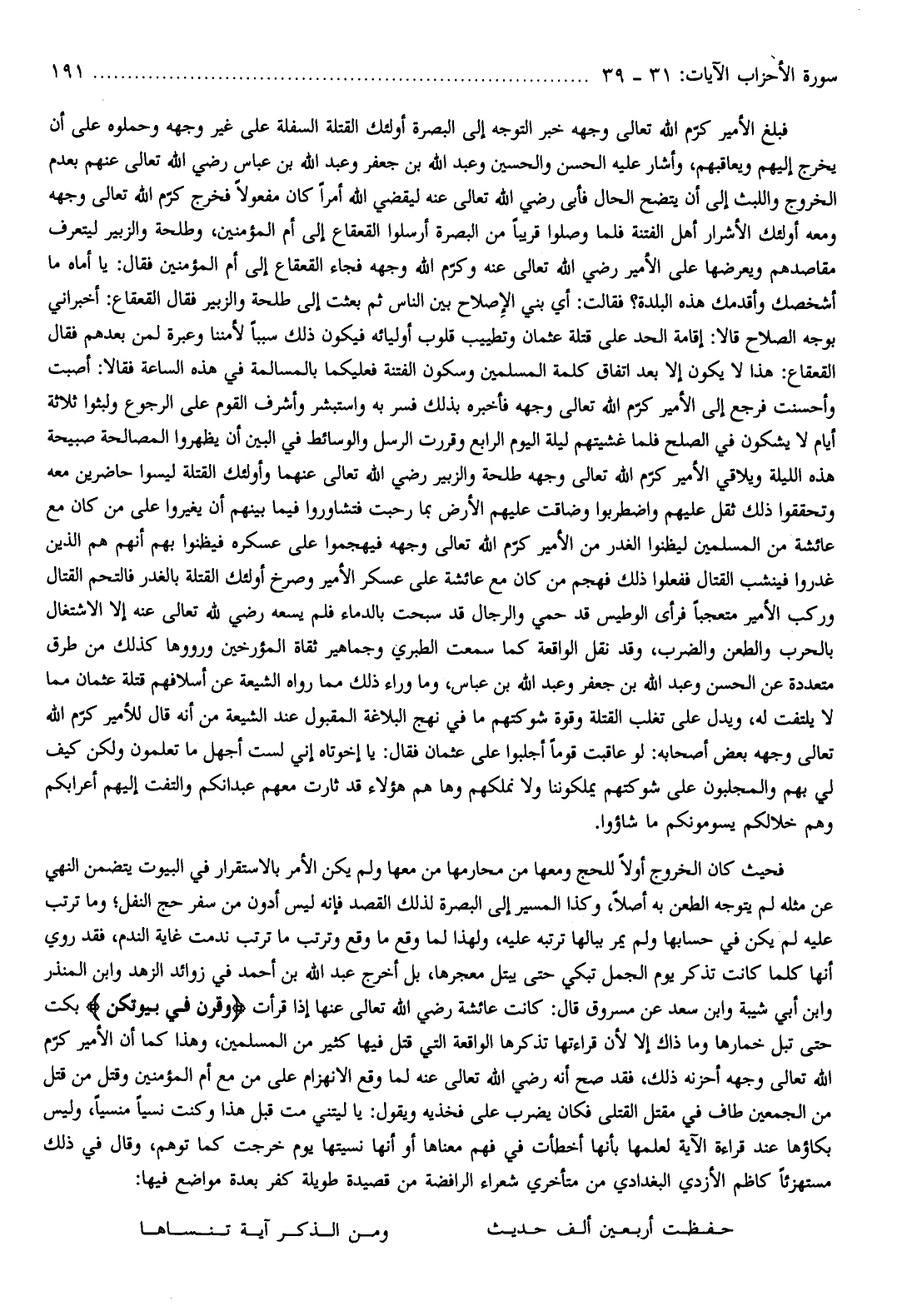 فحيث كان الخروج أولا للحج ومعها من محارمها من معها ولم يكن الأمر بالاستقرار في البيوت يتضمن النهي عن مثله لم يتوجه الطعن به أصلا، وكذا المسير إلى البصرة لذلك القصد فإنه ليس أدون من سفر حج النفل وما ترتب عليه لم يكن في حسابها ولم يمر ببالها ترتبه عليه، ولهذا لما وقع ما وقع وترتب ما ترتب ندمت غاية الندم، فقد روي أنها كلما كانت تذكر يوم الجمل تبكي حتى يبتل معجرها، بل أخرج عبد الله بن أحمد في زوائد الزهد وابن المنذر وابن أبي شيبة وابن سعد عن مسروق قال: كانت عائشة رضي الله تعالى عنها إذا قرأت وَقَرْنَ فِي بُيُوتِكُنَّ بكت حتى تبل خمارها وما ذاك إلا لأن قراءتها تذكرها الواقعة التي قتل فيها كثير من المسلمين، وهذا كما أن الأمير كرّم الله تعالى وجهه أحزنه ذلك،