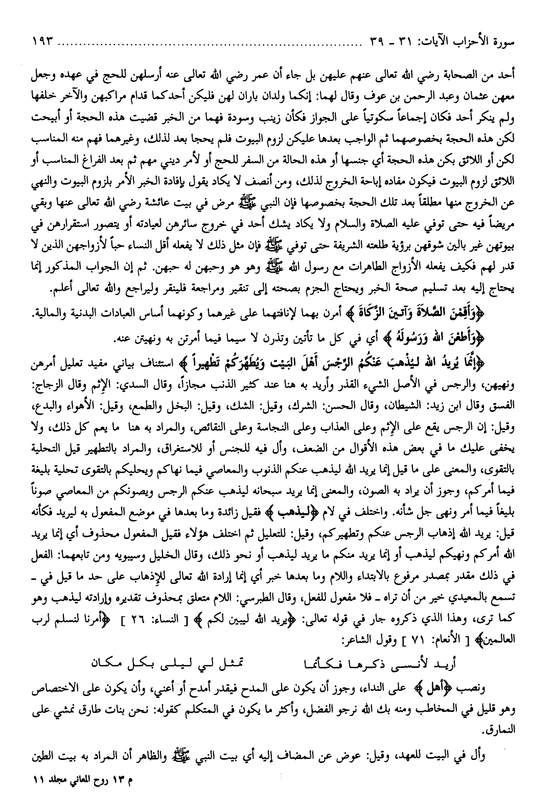 إِنَّما يُرِيدُ اللَّهُ لِيُذْهِبَ عَنْكُمُ الرِّجْسَ أَهْلَ الْبَيْتِ وَيُطَهِّرَكُمْ تَطْهِيراً استئناف بياني مفيد تعليل أمرهن ونهيهن، والرجس في الأصل الشيء القذر وأريد به هنا عند كثير الذنب مجازا، وقال السدي: الإثم وقال الزجاج: