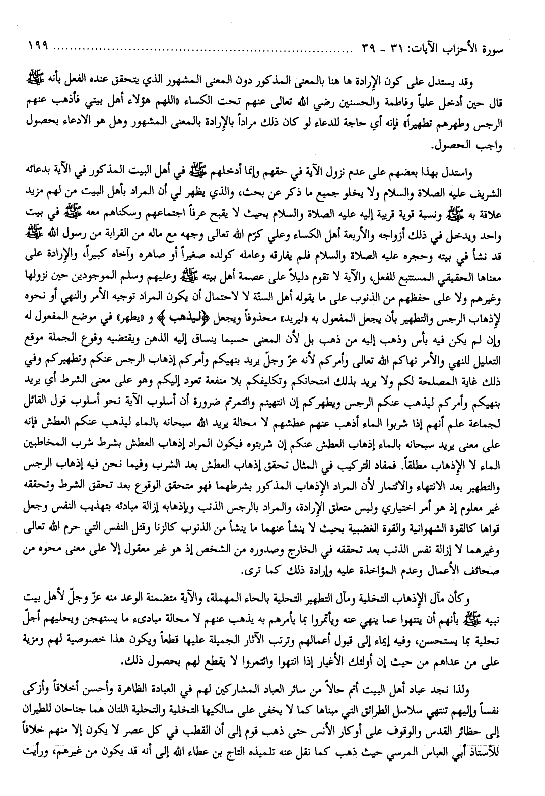 واستدل بهذا بعضهم على عدم نزول الآية في حقهم وإنما أدخلهم صلّى الله عليه وسلم في أهل البيت المذكور في الآية بدعائه الشريف عليه الصلاة والسلام ولا يخلو جميع ما ذكر عن بحث، والذي يظهر لي أن المراد بأهل البيت من لهم مزيد علاقة به صلّى الله عليه وسلم ونسبة قوية قريبة إليه عليه الصلاة والسلام بحيث لا يقبح عرفا اجتماعهم وسكناهم معه صلّى الله عليه وسلم في بيت واحد ويدخل في ذلك أزواجه والأربعة أهل الكساء وعلي كرّم الله تعالى وجهه مع ماله من القرابة من رسول الله صلّى الله عليه وسلم قد نشأ في بيته وحجره عليه الصلاة والسلام فلم يفارقه وعامله كولده صغيرا أو صاهره وآخاه كبيرا، والإرادة على معناها الحقيقي المستتبع للفعل، والآية لا تقوم دليلا على عصمة أهل بيته صلّى الله عليه وسلم وعليهم وسلم الموجودين حين نزولها وغيرهم ولا على حفظهم من الذنوب على ما يقوله أهل السنّة لا لاحتمال أن يكون المراد توجيه الأمر والنهي أو نحوه لإذهاب الرجس والتطهير بأن يجعل المفعول به «ليريد» محذوفا ويجعل لِيُذْهِبَ و «يطهر» في موضع المفعول له وإن لم يكن فيه بأس وذهب إليه من ذهب بل لأن المعنى حسبما ينساق إليه الذهن ويقتضيه وقوع الجملة موقع التعليل للنهي والأمر نهاكم الله تعالى وأمركم لأنه عزّ وجلّ يريد بنهيكم وأمركم إذهاب الرجس عنكم وتطهيركم وفي ذلك غاية المصلحة لكم ولا يريد بذلك امتحانكم وتكليفكم بلا منفعة تعود إليكم وهو على معنى الشرط أي يريد بنهيكم وأمركم ليذهب عنكم الرجس ويطهركم إن انتهيتم وائتمرتم ضرورة أن أسلوب الآية نحو أسلوب قول القائل لجماعة علم أنهم إذا شربوا الماء أذهب عنهم عطشهم لا محالة يريد الله سبحانه بالماء ليذهب عنكم العطش فإنه على معنى يريد سبحانه بالماء إذهاب العطش عنكم إن شربتوه فيكون المراد إذهاب العطش بشرط شرب المخاطبين الماء لا الإذهاب مطلقا. فمفاد التركيب في المثال تحقق إذهاب العطش بعد الشرب وفيما نحن فيه إذهاب الرجس والتطهير بعد الانتهاء والائتمار لأن المراد الإذهاب المذكور بشرطهما فهو متحقق الوقوع بعد تحقق الشرط وتحققه غير معلوم إذ هو أمر اختياري وليس متعلق الإرادة، والمراد بالرجس الذنب وبإذهابه إزالة مبادئه بتهذيب النفس وجعل قواها كالقوة الشهوانية والقوة الغضبية بحيث لا ينشأ عنهما ما ينشأ من الذنوب كالزنا وقتل النفس التي حرم الله تعالى وغيرهما لا إزالة نفس الذنب بعد تحققه في الخارج وصدوره من الشخص إذ هو غير معقول إلا على معنى محوه من صحائف الأعمال وعدم المؤاخذة عليه وإرادة ذلك كما ترى.
