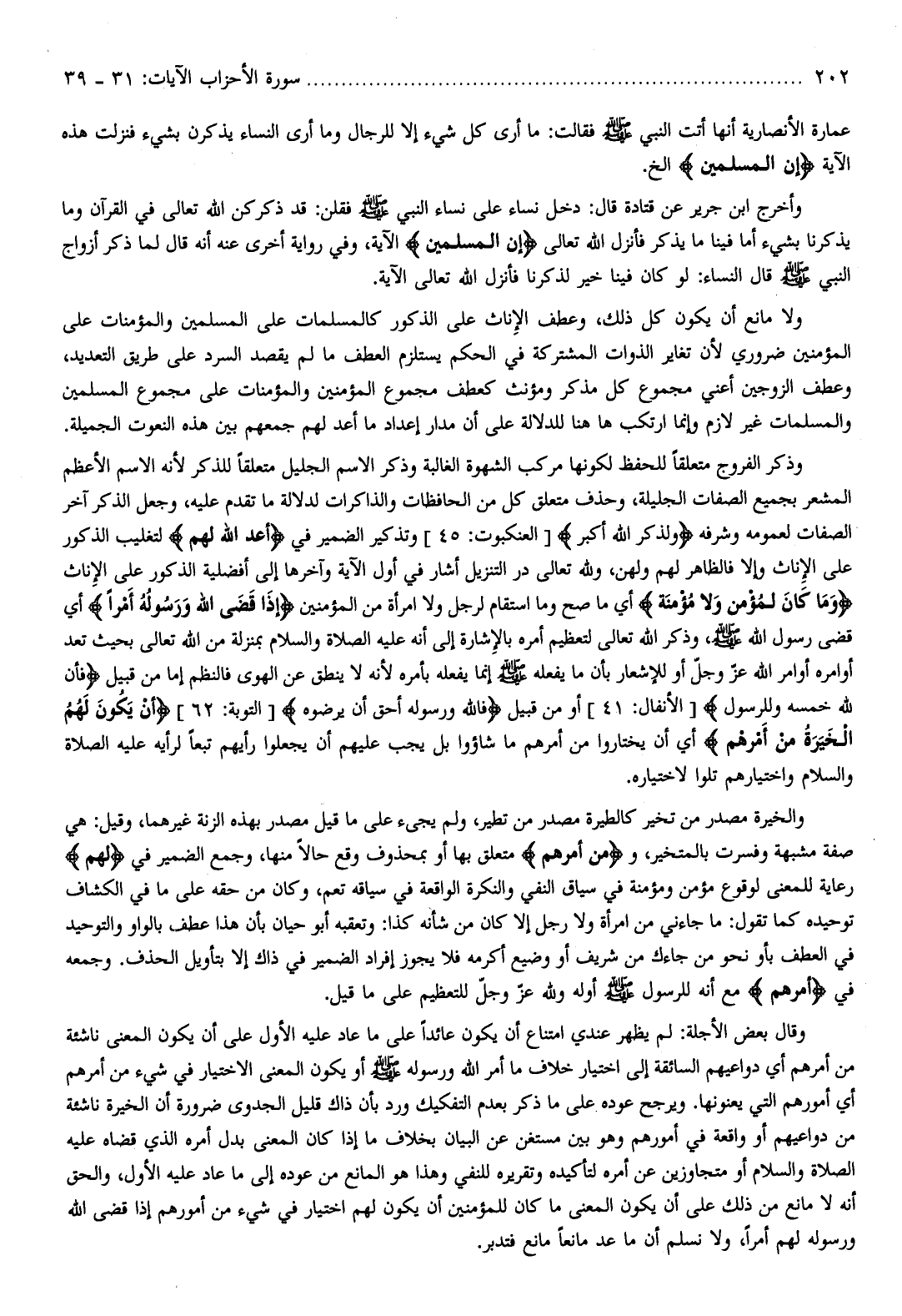 وأخرج ابن جرير عن قتادة قال: دخل نساء على نساء النبي صلّى الله عليه وسلم فقلن: قد ذكركن الله تعالى في القرآن وما يذكرنا بشيء أما فينا ما يذكر فأنزل الله تعالى إِنَّ الْمُسْلِمِينَ الآية