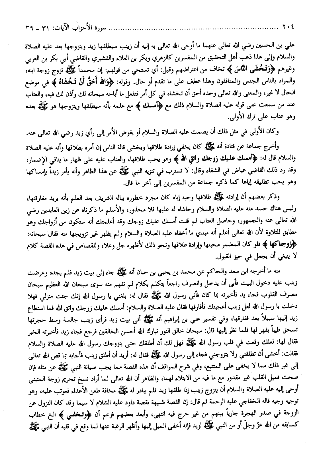 وفي تفسير علي بن إبراهيم أنه صلّى الله عليه وسلم أتى بيت زيد فرأى زينب جالسة وسط حجرتها تسحق طيبا بفهر لها فلما نظر إليها قال: سبحان خالق النور تبارك الله أحسن الخالقين فرجع فجاء زيد فأخبرته الخبر فقال لها: لعلك وقعت في قلب رسول الله صلّى الله عليه وسلم فهل لك أن أطلقك حتى يتزوجك رسول الله عليه الصلاة والسلام فقالت: أخشى أن تطلقني ولا يتزوجني فجاء إلى رسول الله صلّى الله عليه وسلم فقال له: أريد أن أطلق زينب فأجابه بما قص الله تعالى