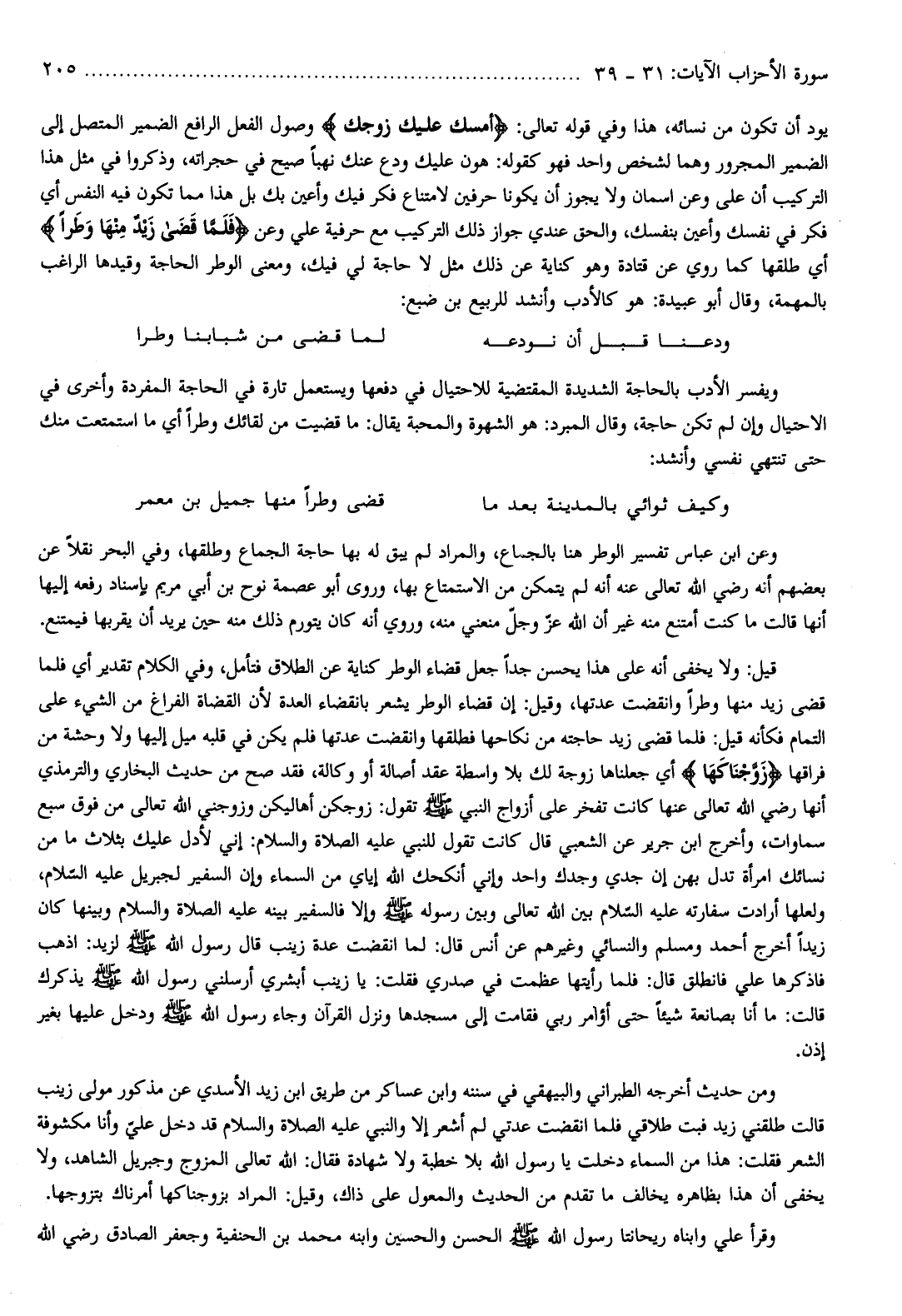 يود أن تكون من نسائه، هذا وفي قوله تعالى: أَمْسِكْ عَلَيْكَ زَوْجَكَ وصول الفعل الرافع الضمير المتصل إلى الضمير المجرور وهما لشخص واحد فهو كقوله: هون عليك ودع عنك نهبا صيح في حجراته، وذكروا في مثل هذا التركيب أن على وعن اسمان ولا يجوز أن يكونا حرفين لامتناع فكر فيك وأعين بك بل هذا مما تكون فيه النفس أي فكر في نفسك وأعين بنفسك، والحق عندي جواز ذلك التركيب مع حرفية علي وعن فَلَمَّا قَضى زَيْدٌ مِنْها وَطَراً أي طلقها كما روي عن قتادة وهو كناية عن ذلك مثل لا حاجة لي فيك، ومعنى الوطر الحاجة وقيدها الراغب بالمهمة، وقال أبو عبيدة: هو كالأدب وأنشد للربيع بن ضبع: