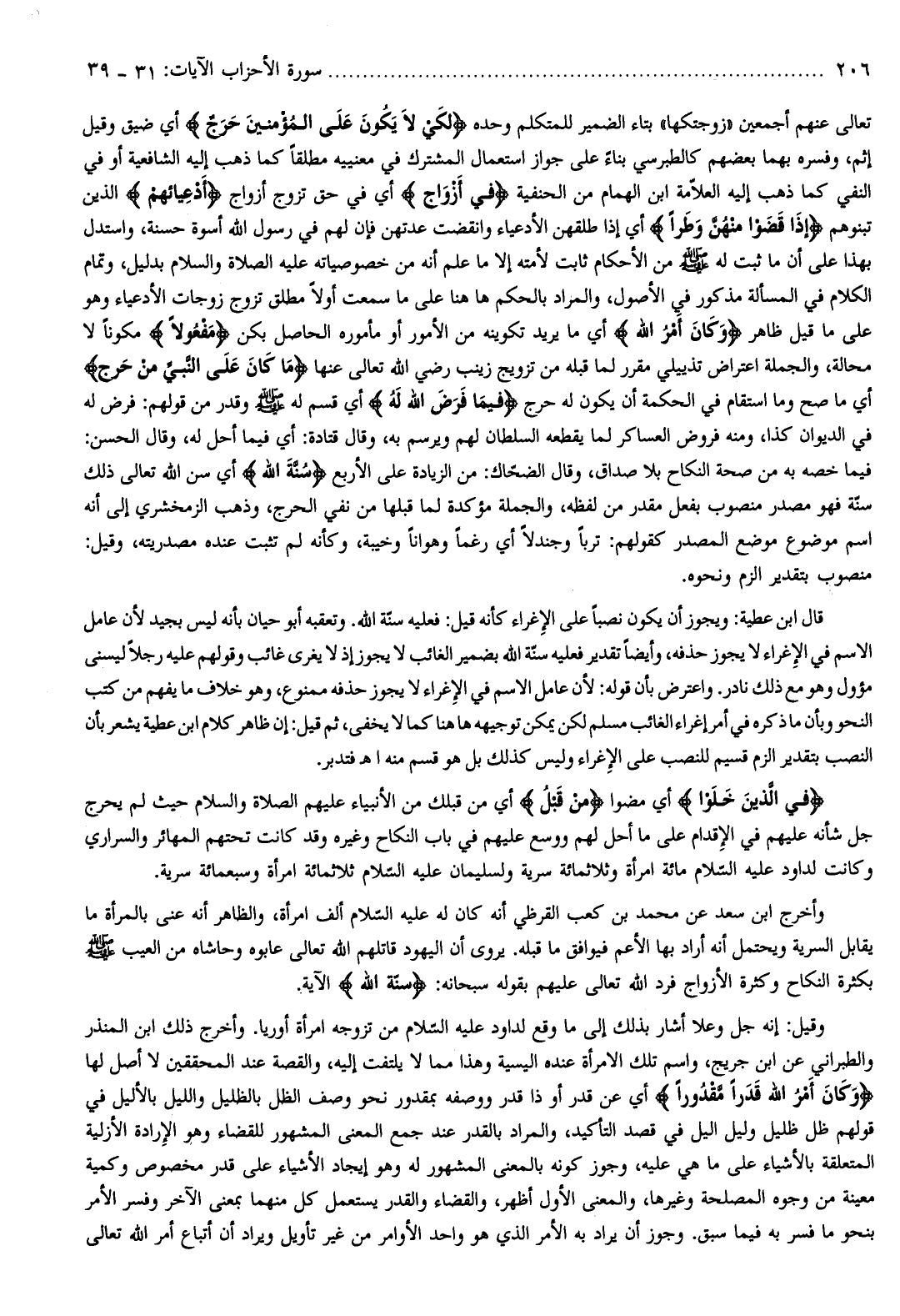 وقيل: إنه جل وعلا أشار بذلك إلى ما وقع لداود عليه السّلام من تزوجه امرأة أوريا. وأخرج ذلك ابن المنذر والطبراني عن ابن جريج، واسم تلك الامرأة عنده اليسية وهذا مما لا يلتفت إليه، والقصة عند المحققين لا أصل لها وَكانَ أَمْرُ اللَّهِ قَدَراً مَقْدُوراً أي عن قدر أو ذا قدر ووصفه بمقدور نحو وصف الظل بالظليل والليل بالأليل في قولهم ظل ظليل وليل أليل في قصد التأكيد، والمراد بالقدر عند جمع المعنى المشهور للقضاء وهو الإرادة الأزلية المتعلقة بالأشياء على ما هي عليه، وجوز كونه بالمعنى المشهور له وهو إيجاد الأشياء على قدر مخصوص وكمية معينة من وجوه المصلحة وغيرها، والمعنى الأول أظهر، والقضاء والقدر يستعمل كل منهما بمعنى الآخر وفسر الأمر بنحو ما فسر به فيما سبق. وجوز أن يراد به الأمر الذي هو واحد الأوامر من غير تأويل ويراد أن أتباع أمر الله تعالى