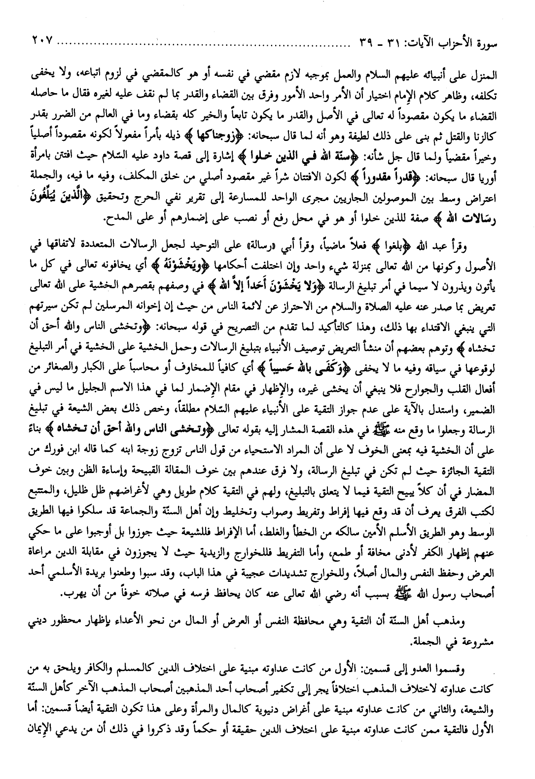 وقرأ عبد الله بلغوا فعلا ماضيا، وقرأ أبي «رسالة» على التوحيد لجعل الرسالات المتعددة لاتفاقها في الأصول وكونها من الله تعالى بمنزلة شيء واحد وإن اختلفت أحكامها وَيَخْشَوْنَهُ أي يخافونه تعالى في كل ما يأتون ويذرون لا سيما في أمر تبليغ الرسالة وَلا يَخْشَوْنَ أَحَداً إِلَّا اللَّهَ في وصفهم بقصرهم الخشية على الله تعالى تعريض بما صدر عنه عليه الصلاة والسلام من الاحتراز عن لائمة الناس من حيث إن إخوانه المرسلين لم تكن سيرتهم التي ينبغي الاقتداء بها ذلك، وهذا كالتأكيد لما تقدم من التصريح في قوله سبحانه: وَتَخْشَى النَّاسَ وَاللَّهُ أَحَقُّ أَنْ تَخْشاهُ وتوهم بعضهم أن منشأ التعريض توصيف الأنبياء بتبليغ الرسالات وحمل الخشية على الخشية في أمر التبليغ لوقوعها في سياقه وفيه ما لا يخفى وَكَفى بِاللَّهِ حَسِيباً أي كافيا للمخاوف أو محاسبا على الكبار والصغائر من أفعال القلب والجوارح فلا ينبغي أن يخشى غيره، والإظهار في مقام الإضمار لما في هذا الاسم الجليل ما ليس في الضمير، واستدل بالآية على عدم جواز التقية على الأنبياء عليهم السّلام مطلقا، وخص ذلك بعض الشيعة في تبليغ الرسالة وجعلوا ما وقع منه صلّى الله عليه وسلم في هذه القصة المشار إليه بقوله تعالى وَتَخْشَى النَّاسَ وَاللَّهُ أَحَقُّ أَنْ تَخْشاهُ بناء على أن الخشية فيه بمعنى الخوف لا على أن المراد الاستحياء من قول الناس تزوج زوجة ابنه كما قاله ابن فورك من التقية الجائزة حيث لم تكن في تبليغ الرسالة، ولا فرق عندهم بين خوف المقالة القبيحة وإساءة الظن وبين خوف المضار في أن كلا يبيح التقية فيما لا يتعلق بالتبليغ، ولهم في التقية كلام طويل وهي لأغراضهم ظل ظليل، والمتتبع لكتب الفرق يعرف أن قد وقع فيها إفراط وتفريط وصواب وتخليط وإن أهل السنّة والجماعة قد سلكوا فيها الطريق الوسط وهو الطريق الأسلم الأمين سالكه من الخطأ والغلط، أما الإفراط فللشيعة حيث جوزوا بل أوجبوا على ما حكي عنهم إظهار الكفر لأدنى مخافة أو طمع، وأما التفريط فللخوارج والزيدية حيث لا يجوزون في مقابلة الدين مراعاة العرض وحفظ النفس والمال أصلا، وللخوارج تشديدات عجيبة في هذا الباب، وقد سبوا وطعنوا بريدة الأسلمي أحد أصحاب رسول الله صلّى الله عليه وسلم بسبب أنه رضي الله تعالى عنه كان يحافظ فرسه في صلاته خوفا من أن يهرب.
