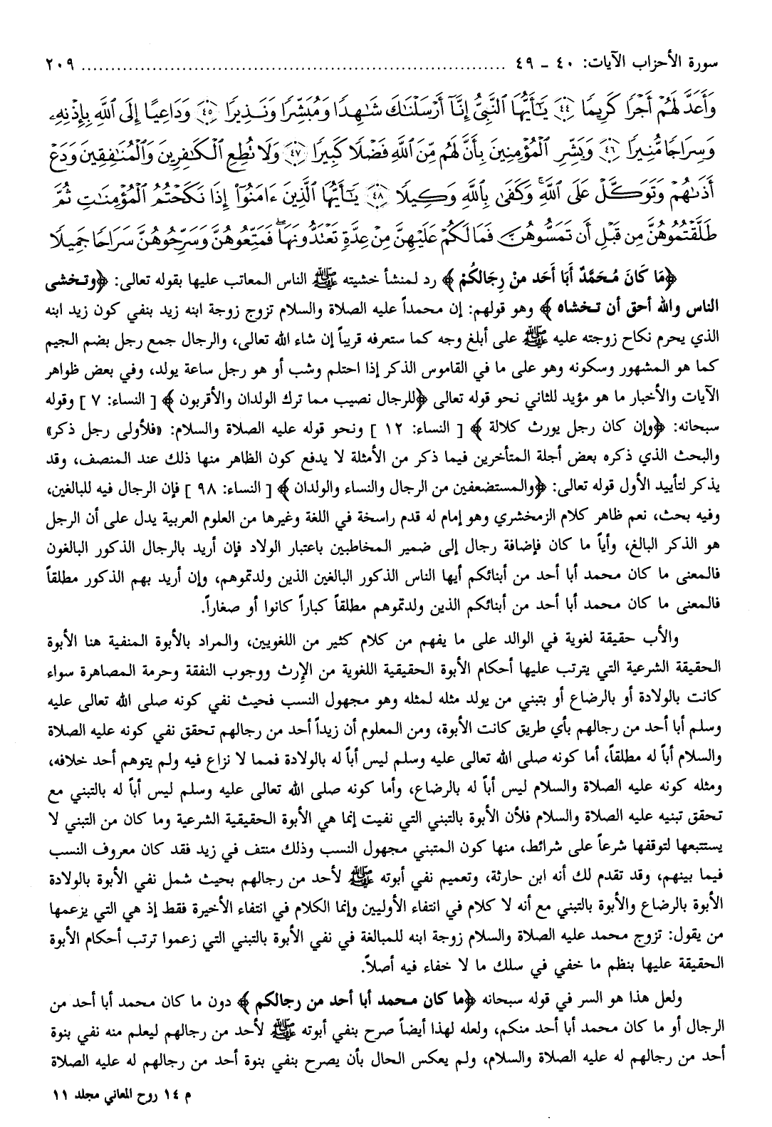 ما كانَ مُحَمَّدٌ أَبا أَحَدٍ مِنْ رِجالِكُمْ رد لمنشأ خشيته صلّى الله عليه وسلم الناس المعاتب عليها بقوله تعالى: وَتَخْشَى النَّاسَ وَاللَّهُ أَحَقُّ أَنْ تَخْشاهُ وهو قولهم: إن محمدا عليه الصلاة والسلام تزوج زوجة ابنه زيد بنفي كون زيد ابنه الذي يحرم نكاح زوجته عليه صلّى الله عليه وسلم على أبلغ وجه كما ستعرفه قريبا إن شاء الله تعالى، والرجال جمع رجل بضم الجيم كما هو المشهور وسكونه وهو على ما في القاموس الذكر إذا احتلم وشب أو هو رجل ساعة يولد، وفي بعض ظواهر الآيات والأخبار ما هو مؤيد للثاني نحو قوله تعالى لِلرِّجالِ نَصِيبٌ مِمَّا تَرَكَ الْوالِدانِ وَالْأَقْرَبُونَ [النساء: 7] وقوله سبحانه: وَإِنْ كانَ رَجُلٌ يُورَثُ كَلالَةً [النساء: 12] ونحو
