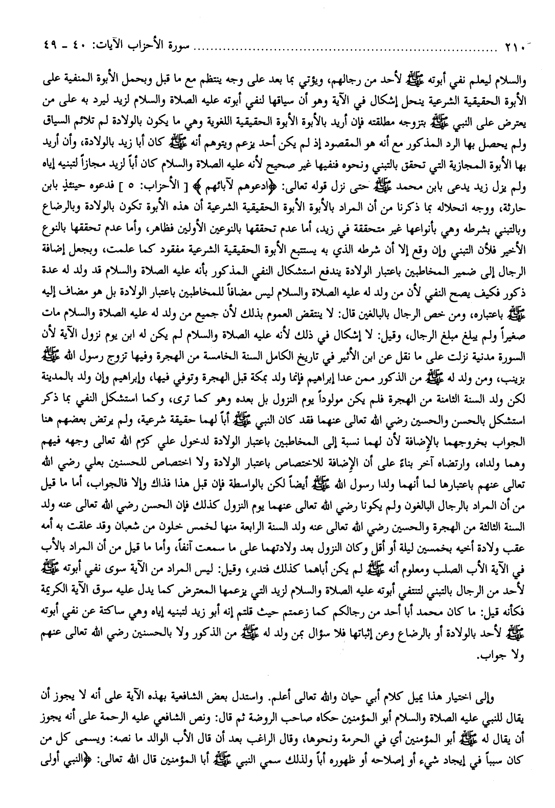 والسلام ليعلم نفي أبوته صلّى الله عليه وسلم لأحد من رجالهم، ويؤتي بما بعد على وجه ينتظم مع ما قبل وبحمل الأبوة المنفية على الأبوة الحقيقية الشرعية ينحل إشكال في الآية وهو أن سياقها لنفي أبوته عليه الصلاة والسلام لزيد ليرد به على من يعترض على النبي صلّى الله عليه وسلم بتزوجه مطلقته فإن أريد بالأبوة الأبوة الحقيقية اللغوية وهي ما يكون بالولادة لم تلائم السياق ولم يحصل بها الرد المذكور مع أنه هو المقصود إذ لم يكن أحد يزعم ويتوهم أنه صلّى الله عليه وسلم كان أبا زيد بالولادة، وأن أريد بها الأبوة المجازية التي تحقق بالتبني ونحوه فنفيها غير صحيح لأنه عليه الصلاة والسلام كان أبا لزيد مجازا لتبنيه إياه ولم يزل زيد يدعى بابن محمد صلّى الله عليه وسلم حتى نزل قوله تعالى: ادْعُوهُمْ لِآبائِهِمْ [الأحزاب: 5] فدعوه حينئذ بابن حارثة، ووجه انحلاله بما ذكرنا من أن المراد بالأبوة الأبوة الحقيقية الشرعية أن هذه الأبوة تكون بالولادة وبالرضاع وبالتبني بشرطه وهي بأنواعها غير متحققة في زيد، أما عدم تحققها بالنوعين الأولين فظاهر، وأما عدم تحققها بالنوع الأخير فلأن التبني وإن وقع إلا أن شرطه الذي به يستتبع الأبوة الحقيقية الشرعية مفقود كما علمت، وبجعل إضافة الرجال إلى ضمير المخاطبين باعتبار الولادة يندفع استشكال النفي المذكور بأنه عليه الصلاة والسلام قد ولد له عدة ذكور فكيف يصح النفي لأن من ولد له عليه الصلاة والسلام ليس مضافا للمخاطبين باعتبار الولادة بل هو مضاف إليه صلّى الله عليه وسلم باعتباره، ومن خص الرجال بالبالغين قال: لا ينتقض العموم بذلك لأن جميع من ولد له عليه الصلاة والسلام مات صغيرا ولم يبلغ مبلغ الرجال، وقيل: لا إشكال في ذلك لأنه عليه الصلاة والسلام لم يكن له ابن يوم نزول الآية لأن السورة مدنية نزلت على ما نقل عن ابن الأثير في تاريخ الكامل السنة الخامسة من الهجرة من الهجرة وفيها تزوج رسول الله صلّى الله عليه وسلم بزينب، ومن ولد له صلّى الله عليه وسلم من الذكور ممن عدا إبراهيم فإنما ولد بمكة قبل الهجرة وتوفي فيها، وإبراهيم وإن ولد بالمدينة لكن ولد السنة الثامنة من الهجرة فلم يكن مولودا يوم النزول بل بعده وهو كما ترى، وكما استشكل النفي بما ذكر استشكل بالحسن والحسين رضي الله تعالى عنهما فقد كان النبي صلّى الله عليه وسلم أبا لهما حقيقة شرعية، ولم يرتض بعضهم هنا الجواب بخروجهما بالإضافة لأن لهما نسبة إلى المخاطبين باعتبار الولادة لدخول علي كرّم الله تعالى وجهه فيهم وهما ولداه، وارتضاه آخر بناء على أن الإضافة للاختصاص باعتبار الولادة ولا اختصاص للحسنين بعلي رضي الله تعالى عنهم باعتبارها لما أنهما ولدا رسول الله صلّى الله عليه وسلم أيضا لكن بالواسطة فإن قبل هذا فذاك وإلا فالجواب، أما ما قيل من أن المراد بالرجال البالغون ولم يكونا رضي الله تعالى عنهما يوم النزول كذلك فإن الحسن رضي الله تعالى عنه ولد السنة الثالثة من الهجرة والحسين رضي الله تعالى عنه ولد السنة الرابعة منها لخمس خلون من شعبان وقد علقت به أمه عقب ولادة أخيه بخمسين ليلة أو أقل وكان النزول بعد ولادتهما على ما سمعت آنفا، وأما ما قيل من أن المراد بالأب في الآية الأب الصلب ومعلوم أنه صلّى الله عليه وسلم لم يكن أباهما كذلك فتدبر، وقيل: ليس المراد من الآية سوى نفي أبوته صلّى الله عليه وسلم لأحد من الرجال بالتبني لتنتفي أبوته عليه الصلاة والسلام لزيد التي يزعمها المعترض كما يدل عليه سوق الآية الكريمة فكأنه قيل: ما كان محمد أبا أحد من رجالكم كما زعمتم حيث قلتم إنه أبو زيد لتبنيه إياه وهي ساكتة عن نفي أبوته صلّى الله عليه وسلم لأحد بالولادة أو بالرضاع وعن إثباتها فلا سؤال بمن ولد