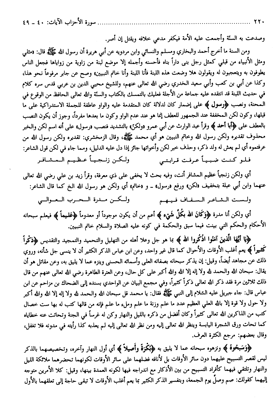 وكذا عن أبي بن كعب وأبي سعيد الخدري رضي الله تعالى عنهم، وللشيخ محيي الدين بن عربي قدس سره كلام في حديث اللبنة قد انتقده عليه جماعة من الأجلة فعليك بالتمسك بالكتاب والسنّة والله تعالى الحافظ من الوقوع في المحنة، ونصب رَسُولَ على إضمار كان لدلالة كان المتقدمة عليه والواو عاطفة للجملة الاستدراكية على ما قبلها، وكون لكن المخففة عند الجمهور للعطف إنما هو عند عدم الواو وكون ما بعدها مفردا، وجوز أن يكون النصب بالعطف على أَبا أَحَدٍ وقرأ عبد الوارث عن أبي عمرو «ولكنّ» بالتشديد فنصب «رسول» على أنه اسم لكن والخبر محذوف تقديره ولكن رسول الله وخاتم النبيين هو أي محمد صلّى الله عليه وسلم، وقال الزمخشري: تقديره ولكن رسول الله من عرفتموه أي لم يعش له ولد ذكر، وحذف خبر لكن وأخواتها جائز إذا دل عليه الدليل، ومما جاء في لكن قول الشاعر: