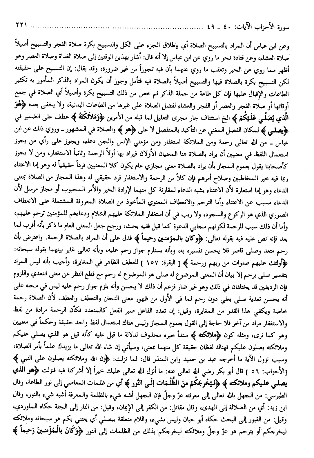 وعن ابن عباس أن المراد بالتسبيح الصلاة أي بإطلاق الجزء على الكل والتسبيح بكرة صلاة الفجر والتسبيح أصيلا صلاة العشاء، وعن قتادة نحو ما روي عن ابن عباس إلا أنه قال: أشار بهذين الوقتين إلى صلاة الغداة وصلاة العصر وهو أظهر مما روي عن الحبر وتعقب ما روي عنهما بأن فيه تجوزا من غير ضرورة، وقد يقال: إن التسبيح على حقيقته لكن التسبيح بكرة بالصلاة فيها والتسبيح أصيلا بالصلاة فيه فتأمل وجوز أن يكون المراد بالذكر المأمور به تكثير الطاعات والإقبال عليها فإن كل طاعة من جملة الذكر ثم خص من ذلك التسبيح بكرة وأصيلا أي الصلاة في جمع أوقاتها أو صلاة الفجر والعصر أو الفجر والعشاء لفضل الصلاة على غيرها من الطاعات البدنية، ولا يخفى بعده هُوَ الَّذِي يُصَلِّي عَلَيْكُمْ إلخ استئناف جار مجرى التعليل لما قبله من الأمرين وَمَلائِكَتُهُ عطف على الضمير في يُصَلِّي لمكان الفصل المغني عن التأكيد بالمنفصل لا على هُوَ والصلاة في المشهور- وروي ذلك عن ابن عباس- من الله تعالى رحمة ومن الملائكة استغفار ومن مؤمني الإنس والجن دعاء، ويجوز على رأي من يجوز استعمال اللفظ في معنيين أن يراد بالصلاة هنا المعنيان الأولان فيراد بها أولا الرحمة وثانيا الاستغفار، ومن لا يجوز كأصحابنا يقول بعموم المجاز بأن يراد بالصلاة معنى مجازي عام يكون كلا المعنيين فردا حقيقيا له وهو إما الاعتناء ربما فيه خير المخاطبين وصلاح أمرهم فإن كلا من الرحمة والاستغفار فرد حقيقي له وهذا المجاز من الصلاة بمعنى الدعاء وهو إما استعارة لأن الاعتناء يشبه الدعاء لمقارنة كل منهما لإرادة الخير والأمر المحبوب أو مجاز مرسل لأن الدعاء مسبب عن الاعتناء وأما الترحم والانعطاف المعنوي المأخوذ من الصلاة المعروفة المشتملة على الانعطاف الصوري الّذي هو الركوع والسجود، ولا ريب في أن استغفار الملائكة عليهم السّلام ودعاءهم للمؤمنين ترحم عليهم، وأما أن ذلك سبب للرحمة لكونهم مجابي الدعوة كما قيل ففيه بحث، ورجح جعل المعنى العام ما ذكر بأنه أقرب لما بعد فإنه نص عليه فيه بقوله تعالى: وَكانَ بِالْمُؤْمِنِينَ رَحِيماً فدل على أن المراد بالصلاة الرحمة. واعترض بأن رحم متعد وصلى قاصر فلا يحسن تفسيره به، وبأنه يستلزم جواز رحم عليه، وبأنه تعالى غاير بينهما بقوله سبحانه: