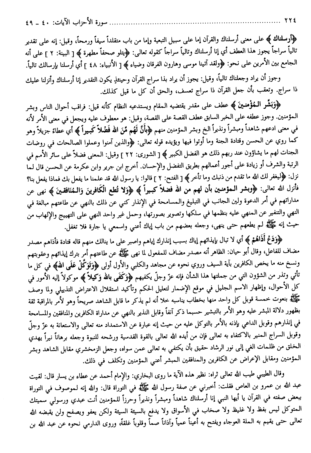 وَبَشِّرِ الْمُؤْمِنِينَ عطف على مقدر يقتضيه المقام ويستدعيه النظام كأنه قيل: فراقب أحوال الناس وبشر المؤمنين. وجوز عطفه على الخبر السابق عطف القصة على القصة، وقيل: هو معطوف عليه ويجعل في معنى الأمر لأنه في معنى ادعهم شاهدا ومبشرا ونذيرا إلخ وبشر المؤمنين منهم بِأَنَّ لَهُمْ مِنَ اللَّهِ فَضْلًا كَبِيراً أي عطاء جزيلا وهو كما روي عن الحسن وقتادة الجنة وما أوتوا فيها ويؤيده قوله تعالى: وَالَّذِينَ آمَنُوا وَعَمِلُوا الصَّالِحاتِ فِي رَوْضاتِ الْجَنَّاتِ لَهُمْ ما يَشاؤُنَ عِنْدَ رَبِّهِمْ ذلِكَ هُوَ الْفَضْلُ الْكَبِيرُ [الشورى: 22] وقيل: المعنى فضلا على سائر الأمم في الرتبة والشرف أو زيادة على أجور أعمالهم بطريق التفضل والإحسان.