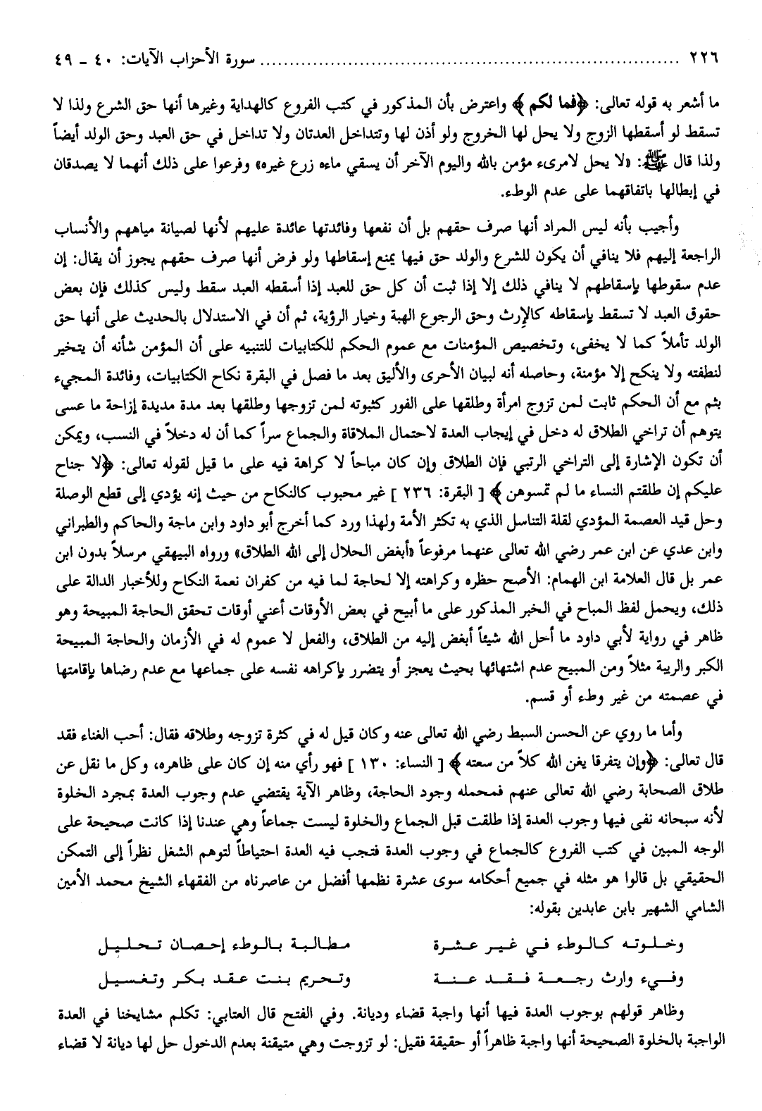 [النساء: 130] فهو رأي منه إن كان على ظاهره، وكل ما نقل عن طلاق الصحابة رضي الله تعالى عنهم فمحمله وجود الحاجة، وظاهر الآية يقتضي عدم وجوب العدة بمجرد الخلوة لأنه سبحانه نفى فيها وجوب العدة إذا طلقت قبل الجماع والخلوة ليست جماعا وهي عندنا إذا كانت صحيحة على الوجه المبين في كتب الفروع كالجماع في وجوب العدة فتجب فيه العدة احتياطا لتوهم الشغل نظرا إلى التمكن الحقيقي بل قالوا هو مثله في جميع أحكامه سوى عشرة نظمها أفضل من عاصرناه من الفقهاء الشيخ محمد الأمين الشامي الشهير بابن عابدين بقوله: