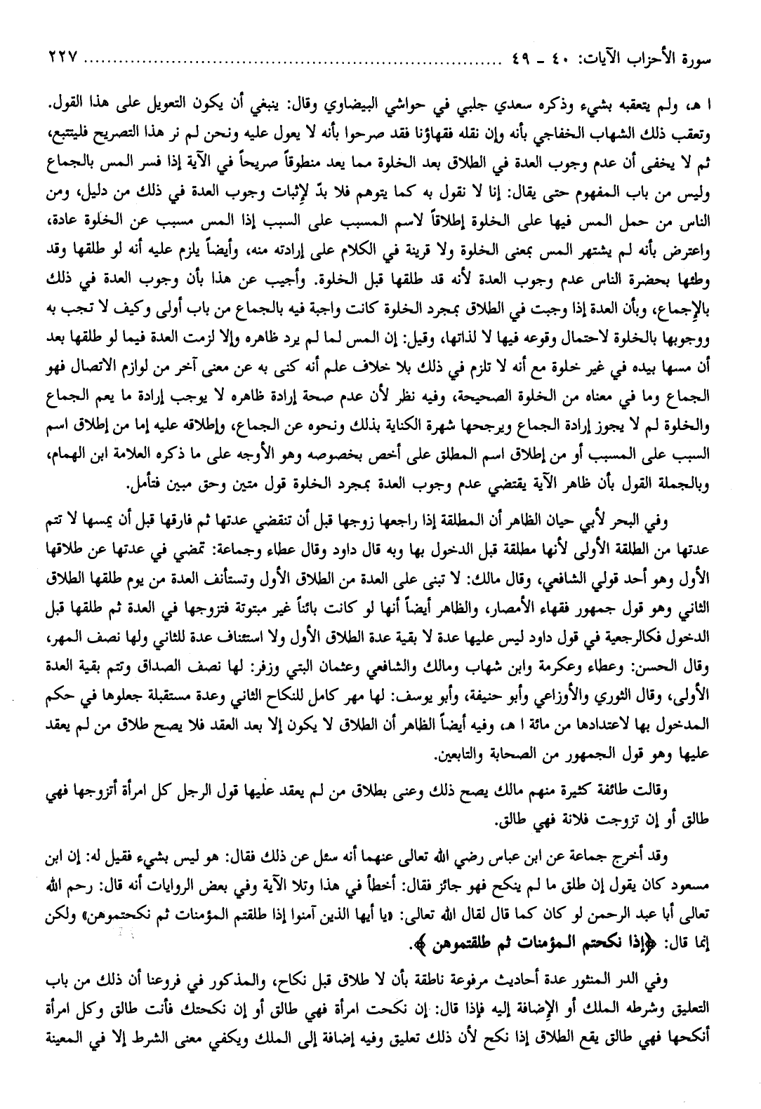 وفي البحر لأبي حيان الظاهر أن المطلقة إذا راجعها زوجها قبل أن تنقضي عدتها ثم فارقها قبل أن يمسها لا تتم عدتها من الطلقة الأولى لأنها مطلقة قبل الدخول بها وبه قال داود وقال عطاء وجماعة: تمضي في عدتها عن طلاقها الأول وهو أحد قولي الشافعي، وقال مالك: لا تبنى على العدة من الطلاق الأول وتستأنف العدة من يوم طلقها الطلاق الثاني وهو قول جمهور فقهاء الأمصار، والظاهر أيضا أنها لو كانت بائنا غير مبتوتة فتزوجها في العدة ثم طلقها قبل الدخول فكالرجعية في قول داود ليس عليها عدة لا بقية عدة الطلاق الأول ولا استئناف عدة للثاني ولها نصف المهر، وقال الحسن: وعطاء وعكرمة وابن شهاب ومالك والشافعي وعثمان البتي وزفر: لها نصف الصداق وتتم بقية العدة الأولى، وقال الثوري والأوزاعي وأبو حنيفة، وأبو يوسف: لها مهر كامل للنكاح الثاني وعدة مستقبلة جعلوها في حكم المدخول بها لاعتدادها من مائة اهـ، وفيه أيضا الظاهر أن الطلاق لا يكون إلا بعد العقد فلا يصح طلاق من لم يعقد عليها وهو قول الجمهور من الصحابة والتابعين.