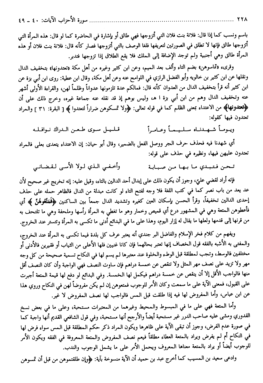 فإنه أراد لقضي عليّ، وجوز أن يكون ذلك على إبدال أحد الدالين بالتاء، وقيل عليه: إنه تخريج غير صحيح لأن عد يعد من باب نصر كما في كتب اللغة فلا وجه لفتح التاء لو كانت مبدلة من الدال فالظاهر حمله على حذف إحدى الدالين تخفيفا، وقرأ الحسن بإسكان العين كغيره وتشديد الدال جمعا بين الساكنين فَمَتِّعُوهُنَّ أي فأعطوهن المتعة وهي في المشهور درع أي قميص وخمار وهو ما تغطي به المرأة رأسها وملحفة وهي ما تلتحف به من قرنها إلى قدمها ولعلها ما يقال له إزار اليوم، وهذا على ما في البدائع أدنى ما تكسى به المرأة وتتستر عند الخروج.
