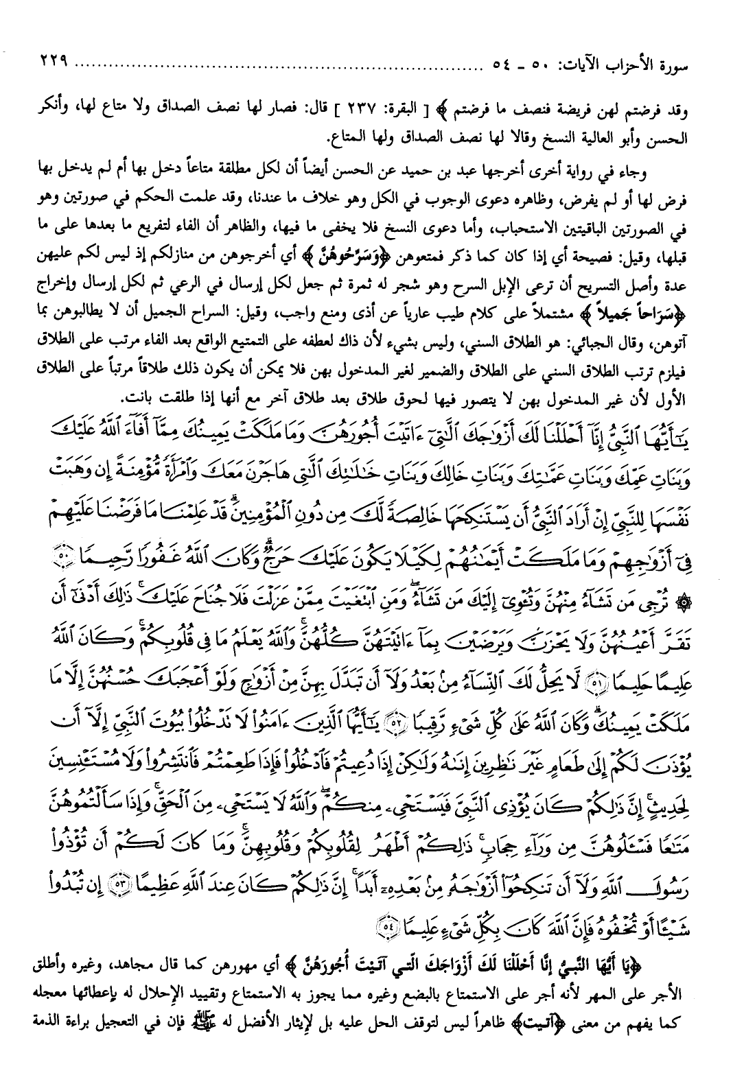 يا أَيُّهَا النَّبِيُّ إِنَّا أَحْلَلْنا لَكَ أَزْواجَكَ اللَّاتِي آتَيْتَ أُجُورَهُنَّ أي مهورهن كما قال مجاهد، وغيره وأطلق الأجر على المهر لأنه أجر على الاستمتاع بالبضع وغيره مما يجوز به الاستمتاع وتقييد الإحلال له بإعطائها معجله كما يفهم من معنى آتَيْتَ ظاهرا ليس لتوقف الحل عليه بل لإيثار الأفضل له صلّى الله عليه وسلم فإن في التعجيل براءة الذمة