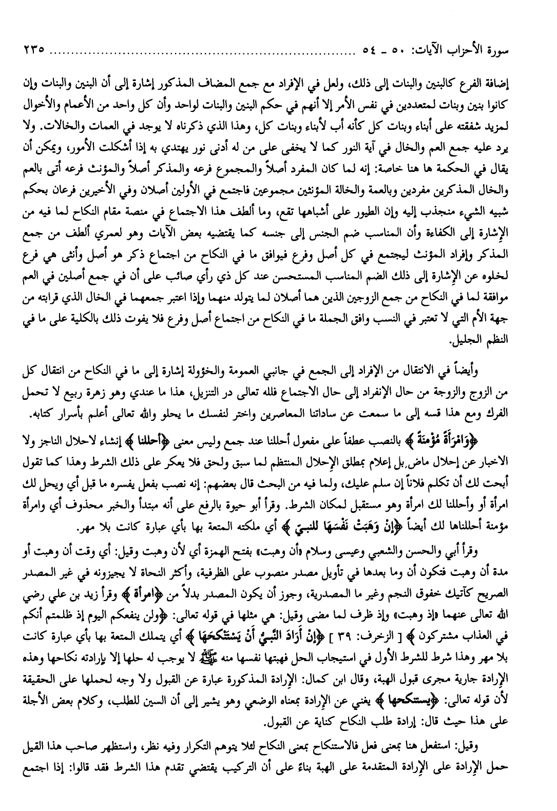 وَامْرَأَةً مُؤْمِنَةً بالنصب عطفا على مفعول أحللنا عند جمع وليس معنى أَحْلَلْنا إنشاء لاحلال الناجز ولا الاخبار عن إحلال ماض بل إعلام بمطلق الإحلال المنتظم لما سبق ولحق فلا يعكر على ذلك الشرط وهذا كما تقول أبحت لك أن تكلم فلانا إن سلم عليك، ولما فيه من البحث قال بعضهم: إنه نصب بفعل يفسره ما قبل أي ويحل لك امرأة أو وأحللنا لك امرأة وهو مستقبل لمكان الشرط. وقرأ أبو حيوة بالرفع على أنه مبتدأ والخبر محذوف أي وامرأة مؤمنة أحللناها لك أيضا إِنْ وَهَبَتْ نَفْسَها لِلنَّبِيِّ أي ملكته المتعة بها بأي عبارة كانت بلا مهر.