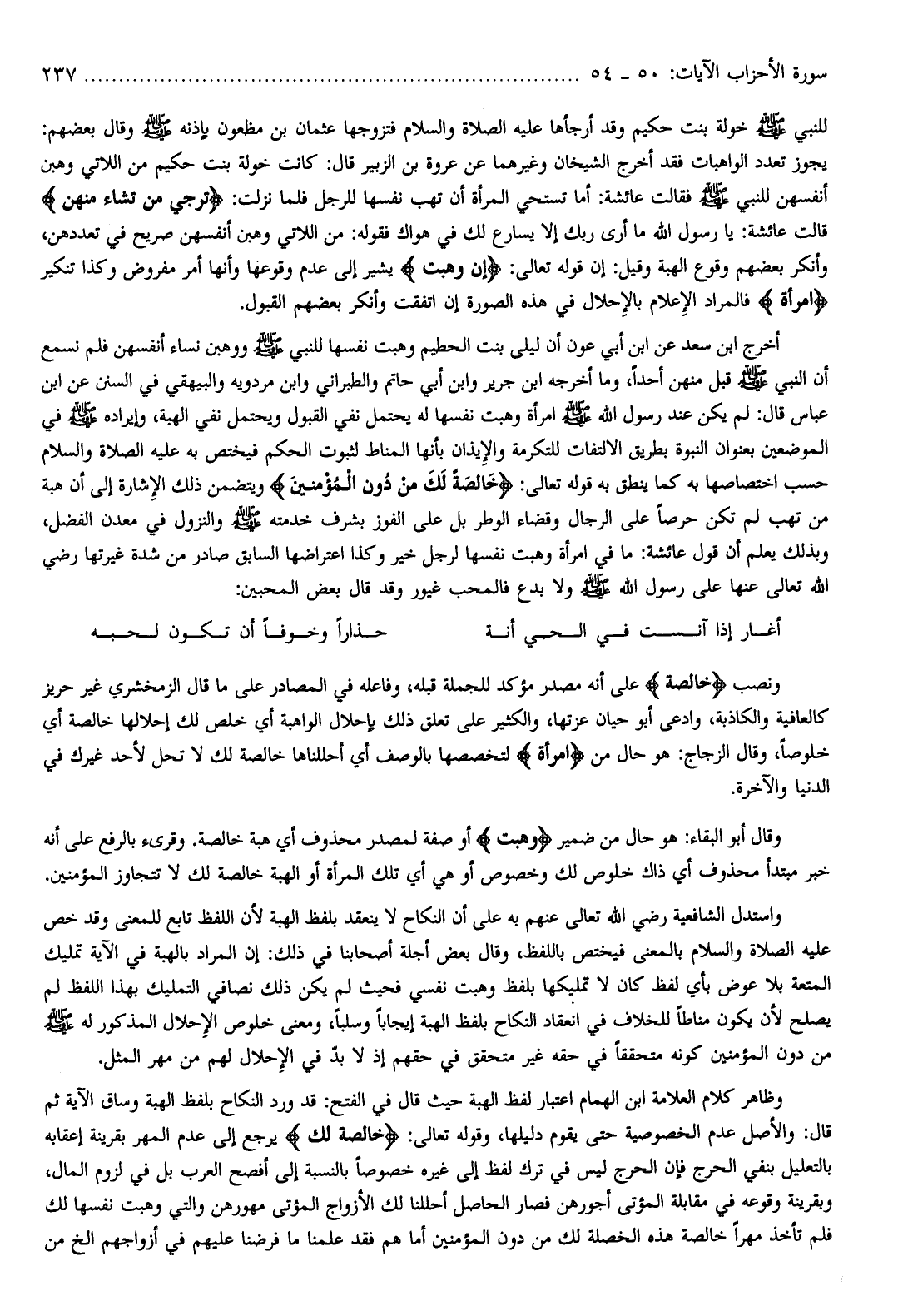 واستدل الشافعية رضي الله تعالى عنهم به على أن النكاح لا ينعقد بلفظ الهبة لأن اللفظ تابع للمعنى وقد خص عليه الصلاة والسلام بالمعنى فيختص باللفظ، وقال بعض أجلة أصحابنا في ذلك: إن المراد بالهبة في الآية تمليك المتعة بلا عوض بأي لفظ كان لا تمليكها بلفظ وهبت نفسي فحيث لم يكن ذلك نصافي التمليك بهذا اللفظ لم يصلح لأن يكون مناطا للخلاف في انعقاد النكاح بلفظ الهبة إيجابا وسلبا، ومعنى خلوص الإحلال المذكور له صلّى الله عليه وسلم من دون المؤمنين كونه متحققا في حقه غير متحقق في حقهم إذ لا بدّ في الإحلال لهم من مهر المثل.