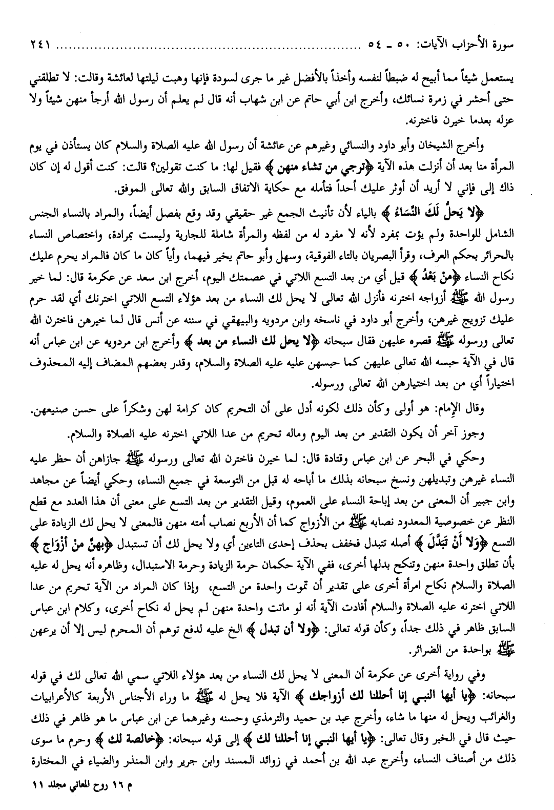 وحكي في البحر عن ابن عباس وقتادة قال: لما خيرن فاخترن الله تعالى ورسوله صلّى الله عليه وسلم جازاهن أن حظر عليه النساء غيرهن وتبديلهن ونسخ سبحانه بذلك ما أباحه له قبل من التوسعة في جميع النساء، وحكي أيضا عن مجاهد وابن جبير أن المعنى من بعد إباحة النساء على العموم، وقيل التقدير من بعد التسع على معنى أن هذا العدد مع قطع النظر عن خصوصية المعدود نصابه صلّى الله عليه وسلم من الأزواج كما أن الأربع نصاب أمته منهن فالمعنى لا يحل لك الزيادة على التسع وَلا أَنْ تَبَدَّلَ أصله تتبدل فخفف بحذف إحدى التاءين أي ولا يحل لك أن تستبدل بِهِنَّ مِنْ أَزْواجٍ بأن تطلق واحدة منهن وتنكح بدلها أخرى، ففي الآية حكمان حرمة الزيادة وحرمة الاستبدال، وظاهره أنه يحل له عليه الصلاة والسلام نكاح امرأة أخرى على تقدير أن تموت واحدة من التسع، وإذا كان المراد من الآية تحريم من عدا اللاتي اخترنه عليه الصلاة والسلام أفادت الآية أنه لو ماتت واحدة منهن لم يحل له نكاح أخرى، وكلام ابن عباس السابق ظاهر في ذلك جدا، وكأن قوله تعالى: وَلا أَنْ تَبَدَّلَ إلخ عليه لدفع توهم أن المحرم ليس إلا أن يرعهن صلّى الله عليه وسلم بواحدة من الضرائر.