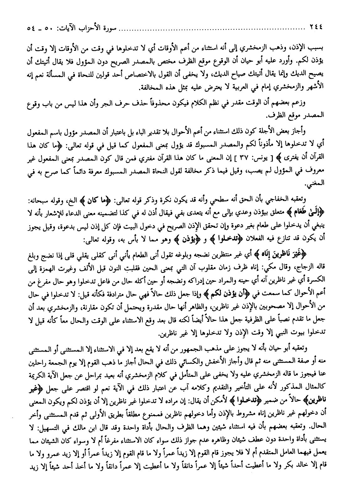 بسبب الإذن، وذهب الزمخشري إلى أنه استثناء من أعم الأوقات أي لا تدخلوها في وقت من الأوقات إلا وقت أن يؤذن لكم. وأورد عليه أبو حيان أن الوقوع موقع الظرف مختص بالمصدر الصريح دون المؤول فلا يقال أتيتك أن يصيح الديك وإنما يقال أتيتك صياح الديك، ولا يخفى أن القول بالاختصاص أحد قولين للنحاة في المسألة نعم إنه الأشهر والزمخشري إمام في العربية لا يعترض عليه بمثل هذه المخالفة.