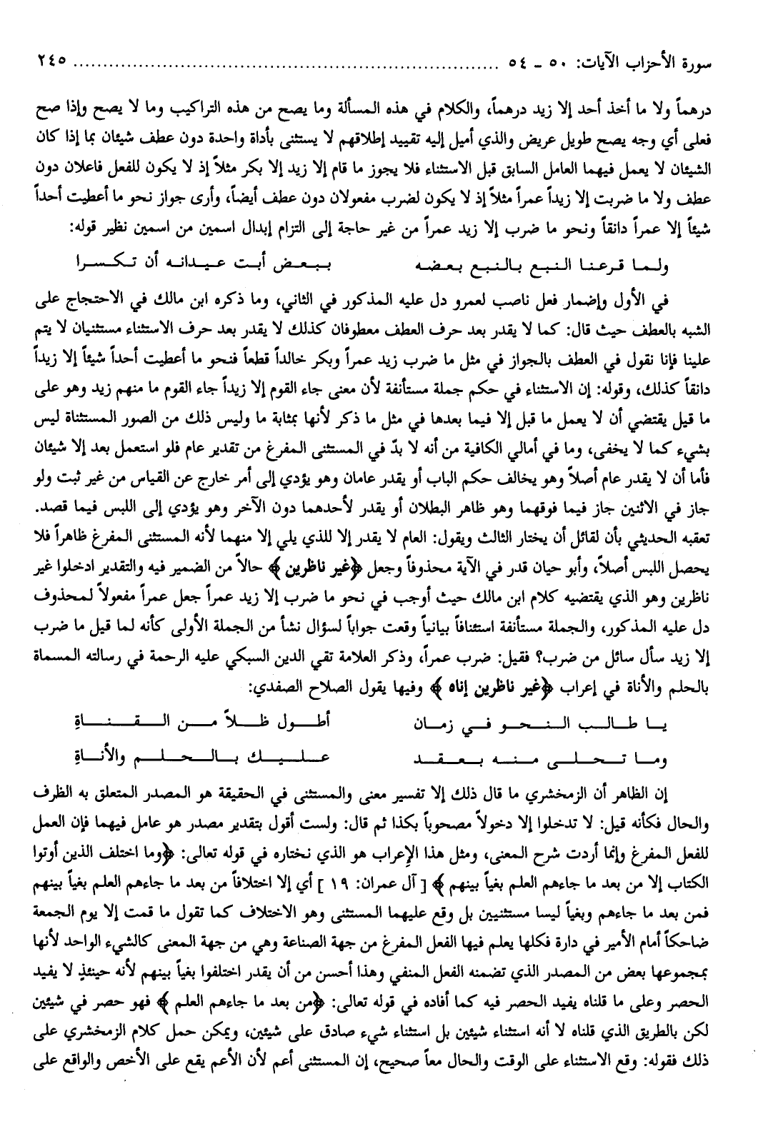 تعقبه الحديثي بأن لقائل أن يختار الثالث ويقول: العام لا يقدر إلا للذي يلي إلا منهما لأنه المستثنى المفرغ ظاهرا فلا يحصل اللبس أصلا، وأبو حيان قدر في الآية محذوفا وجعل غَيْرَ ناظِرِينَ حالا من الضمير فيه والتقدير ادخلوا غير ناظرين وهو الذي يقتضيه كلام ابن مالك حيث أوجب في نحو ما ضرب إلا زيد عمرا جعل عمرا مفعولا لمحذوف دل عليه المذكور، والجملة مستأنفة استئنافا بيانيا وقعت جوابا لسؤال نشأ من الجملة الأولى كأنه لما قيل ما ضرب إلا زيد سأل سائل من ضرب؟ فقيل: ضرب عمرا، وذكر العلامة تقي الدين السبكي عليه الرحمة في رسالته المسماة بالحلم والأناة في إعراب غَيْرَ ناظِرِينَ إِناهُ وفيها يقول الصلاح الصفدي: