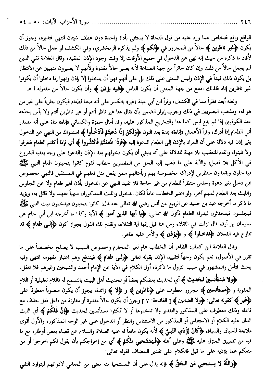 ولعله أبعد نظرا مما في الكشف، وقرأ ابن أبي عبلة «غير» بالكسر على أنه صفة لطعام فيكون جاريا على غير من هو له، ومذهب البصريين في ذلك وجوب إبراز الضمير بأن يقال هنا غير ناظر أنتم أو غير ناظرين أنتم ولا بأس بحذفه عند الكوفيين إذا لم يقع لبس كما هنا والتخريج المذكور عليه، وقد أمال حمزة والكسائي «إناه» بناء على أنه مصدر أني الطعام إذا أدرك، وقرأ الأعمش «إناءة» بمدة بعد النون وَلكِنْ إِذا دُعِيتُمْ فَادْخُلُوا استدراك من النهي عن الدخول بغير إذن فيه دلالة على أن المراد بالإذن إلى الطعام الدعوة إليه فَإِذا طَعِمْتُمْ فَانْتَشِرُوا أي فإذا أكلتم الطعام فتفرقوا ولا تلبثوا، والفاء للتعقيب بلا مهلة للدلالة على أنه ينبغي أن يكون دخولهم بعد الإذن والدعوة على وجه يعقبه الشروع في الأكل بلا فصل، والآية على ما ذهب إليه الجل من المفسرين خطاب لقوم كانوا يتحينون طعام النبي صلّى الله عليه وسلم فيدخلون ويقعدون منتظرين لإدراكه مخصوصة بهم وبأمثالهم ممن يفعل مثل فعلهم في المستقبل فالنهي مخصوص بمن دخل بغير دعوة وجلس منتظرا للطعام من غير حاجة فلا تفيد النهي عن الدخول بأذن لغير طعام ولا عن الجلوس واللبث بعد الطعام لمهم آخر، ولو اعتبر الخطاب عاما لكان الدخول واللبث المذكوران منهيا عنهما ولا قائل به، ويؤيد ما ذكر ما أخرجه عبد بن حميد عن الربيع عن أنس رضي الله تعالى عنه قال: كانوا يتحينون فيدخلون بيت النبي صلّى الله عليه وسلم فيجلسون فيتحدثون ليدرك الطعام فأنزل الله تعالى: يا أَيُّهَا الَّذِينَ آمَنُوا الآية وكذا ما أخرجه ابن أبي حاتم عن سليمان بن أرقم قال نزلت في الثقلاء ومن هنا قيل إنها آية الثقلاء، وتقدم لك القول بجواز كون إِلى طَعامٍ قد تنازع فيه الفعلان تَدْخُلُوا ويُؤْذَنَ والأمر عليه ظاهر.