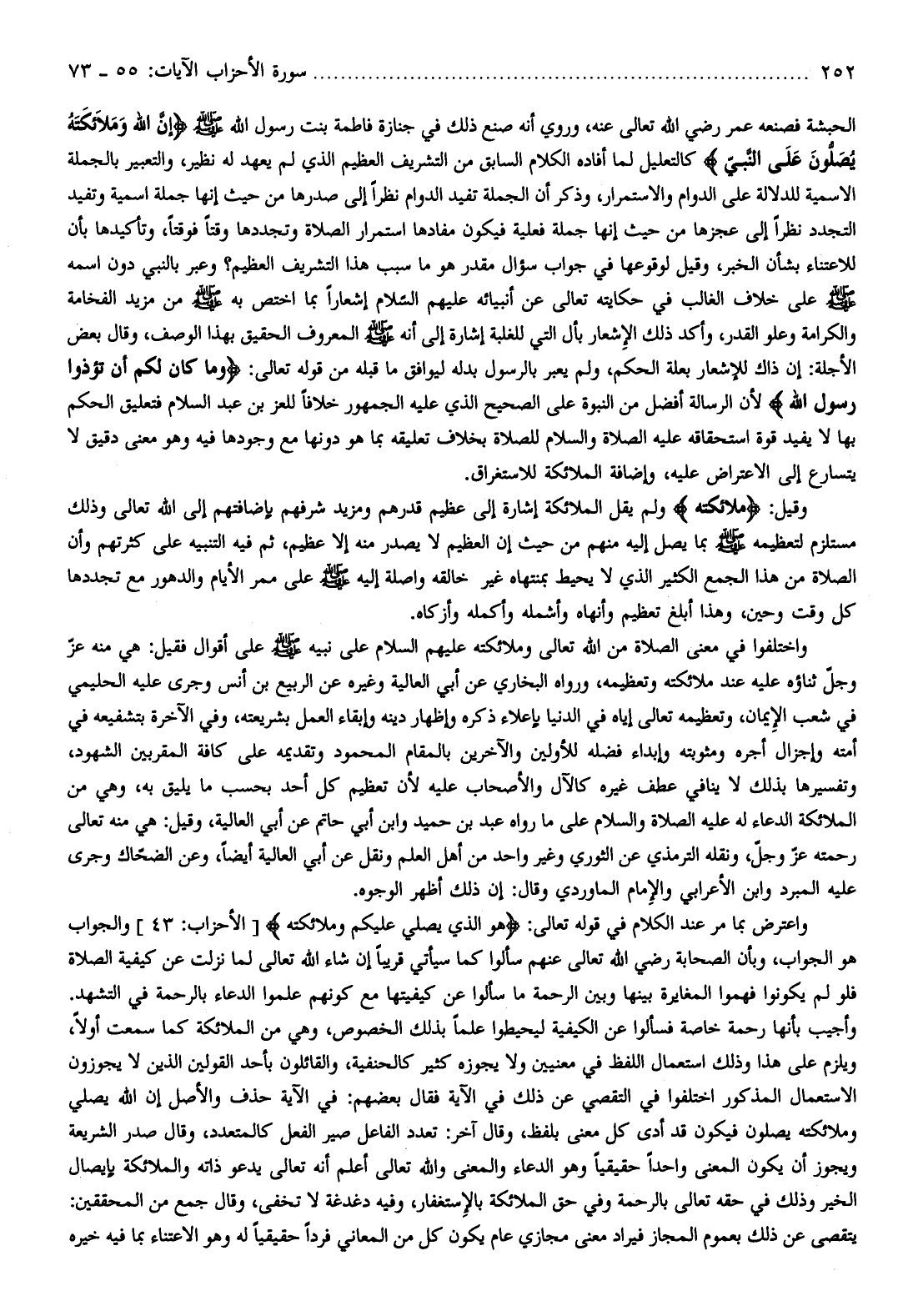الحبشة فصنعه عمر رضي الله تعالى عنه، وروي أنه صنع ذلك في جنازة فاطمة بنت رسول الله صلّى الله عليه وسلم إِنَّ اللَّهَ وَمَلائِكَتَهُ يُصَلُّونَ عَلَى النَّبِيِّ كالتعليل لما أفاده الكلام السابق من التشريف العظيم الذي لم يعهد له نظير، والتعبير بالجملة الاسمية للدلالة على الدوام والاستمرار، وذكر أن الجملة تفيد الدوام نظرا إلى صدرها من حيث إنها جملة اسمية وتفيد التجدد نظرا إلى عجزها من حيث إنها جملة فعلية فيكون مفادها استمرار الصلاة وتجددها وقتا فوقتا، وتأكيدها بأن للاعتناء بشأن الخبر، وقيل لوقوعها في جواب سؤال مقدر هو ما سبب هذا التشريف العظيم؟ وعبر بالنبي دون اسمه صلّى الله عليه وسلم على خلاف الغالب في حكايته تعالى عن أنبيائه عليهم السّلام إشعارا بما اختص به صلّى الله عليه وسلم من مزيد الفخامة والكرامة وعلو القدر، وأكد ذلك الإشعار بأل التي للغلبة إشارة إلى أنه صلّى الله عليه وسلم المعروف الحقيق بهذا الوصف، وقال بعض الأجلة: إن ذاك للإشعار بعلة الحكم، ولم يعبر بالرسول بدله ليوافق ما قبله من قوله تعالى: وَما كانَ لَكُمْ أَنْ تُؤْذُوا رَسُولَ اللَّهِ لأن الرسالة أفضل من النبوة على الصحيح الذي عليه الجمهور خلافا للعز بن عبد السلام فتعليق الحكم بها لا يفيد قوة استحقاقه عليه الصلاة والسلام للصلاة بخلاف تعليقه بما هو دونها مع وجودها فيه وهو معنى دقيق لا يتسارع إلى الاعتراض عليه، وإضافة الملائكة للاستغراق.