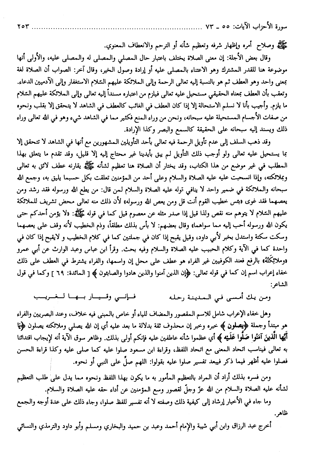 وهل خفاء الإعراب شامل للاسم المقصور والمضاف للياء أو خاص بالمبني فيه خلاف، وعند البصريين والفراء هو مبتدأ وجملة يُصَلُّونَ خبره وخبر إن محذوف ثقة بدلالة ما بعد عليه أي إن الله يصلي وملائكته يصلون يا أَيُّهَا الَّذِينَ آمَنُوا صَلُّوا عَلَيْهِ أي عظموا شأنه عاطفين عليه فإنكم أولى بذلك. وظاهر سوق الآية أنه لإيجاب اقتدائنا به تعالى فيناسب اتحاد المعنى مع اتحاد اللفظ، وقراءة ابن مسعود صلوا عليه كما صلّى عليه وكذا قراءة الحسن فصلوا عليه أظهر فيما ذكر فيبعد تفسير صلوا عليه بقولوا: اللهم صلّ على النبي أو نحوه.