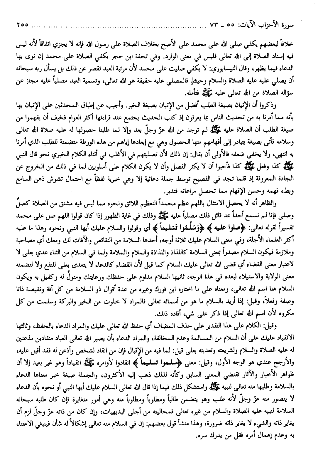 والظاهر أنه لا يحصل الامتثال بأللهم عظم محمدا التعظيم اللائق ونحوه مما ليس فيه مشتق من الصلاة كصلّ وصلّى فإنا لم نسمع أحدا عد قائل ذلك مصليا عليه صلّى الله عليه وسلم وذلك في غاية الظهور إذا كان قولوا اللهم صل على محمد تفسيرا لقوله تعالى: صَلُّوا عَلَيْهِ وَسَلِّمُوا تَسْلِيماً أي وقولوا والسّلام عليك أيها النبي ونحوه وهذا ما عليه أكثر العلماء الأجلة، وفي معنى السّلام عليك ثلاثة أوجه، أحدها السلامة من النقائص والآفات لك ومعك أي مصاحبة وملازمة فيكون السّلام مصدرا بمعنى السلامة كاللذاذ واللذاذة والملام والملامة ولما في السّلام من الثناء عدي بعلى لا لاعتبار معنى القضاء أي قضى الله تعالى عليك السّلام كما قيل لأن القضاء كالدعاء لا يتعدى بعلى للنفع ولا لتضمنه معنى الولاية والاستيلاء لبعده في هذا الوجه، ثانيها السّلام مداوم على حفظك ورعايتك ومتولّ له وكفيل به ويكون السّلام هنا اسم الله تعالى، ومعناه على ما اختاره ابن فورك وغيره من عدة أقوال ذو السلامة من كل آفة ونقيصة ذاتا وصفة وفعلا، وقيل: إذا أريد بالسلام ما هو من أسمائه تعالى فالمراد لا خلوت من الخير والبركة وسلمت من كل مكروه لأن اسم الله تعالى إذا ذكر على شيء أفاده ذلك.