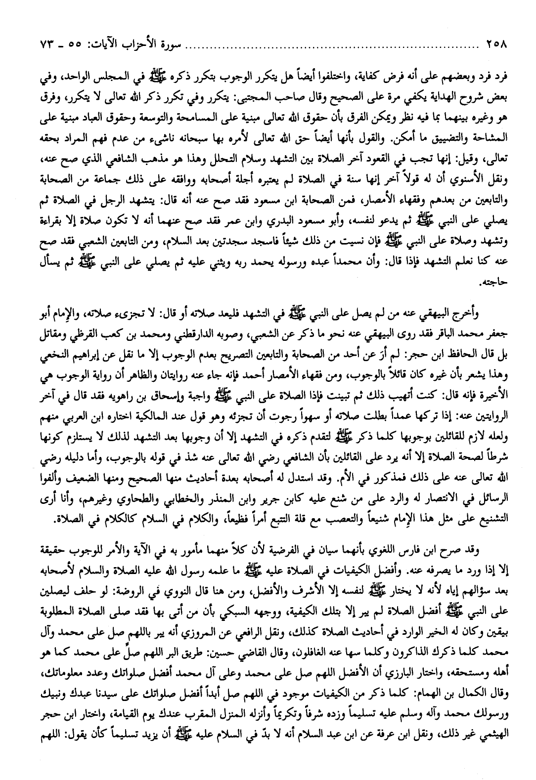 فرد فرد وبعضهم على أنه فرض كفاية، واختلفوا أيضا هل يتكرر الوجوب بتكرر ذكره صلّى الله عليه وسلم في المجلس الواحد، وفي بعض شروح الهداية يكفي مرة على الصحيح وقال صاحب المجتبى: يتكرر وفي تكرر ذكر الله تعالى لا يتكرر، وفرق هو وغيره بينهما بما فيه نظر ويمكن الفرق بأن حقوق الله تعالى مبنية على المسامحة والتوسعة وحقوق العباد مبنية على المشاحة والتضييق ما أمكن. والقول بأنها أيضا حق الله تعالى لأمره بها سبحانه ناشئ من عدم فهم المراد بحقه تعالى، وقيل: إنها تجب في القعود آخر الصلاة بين التشهد وسلام التحلل وهذا هو مذهب الشافعي الذي صح عنه، ونقل الأسنوي أن له قولا آخر إنها سنة في الصلاة لم يعتبره أجلة أصحابه ووافقه على ذلك جماعة من الصحابة والتابعين من بعدهم وفقهاء الأمصار، فمن الصحابة ابن مسعود فقد صح عنه أنه قال: يتشهد الرجل في الصلاة ثم يصلي على النبي صلّى الله عليه وسلم ثم يدعو لنفسه، وأبو مسعود البدري وابن عمر فقد صح عنهما أنه لا تكون صلاة إلا بقراءة وتشهد وصلاة على النبي صلّى الله عليه وسلم فإن نسيت من ذلك شيئا فاسجد سجدتين بعد السلام، ومن التابعين الشعبي فقد صح عنه كنا نعلم التشهد فإذا قال: وأن محمدا عبده ورسوله يحمد ربه ويثني عليه ثم يصلي على النبي صلّى الله عليه وسلم ثم يسأل حاجته.
