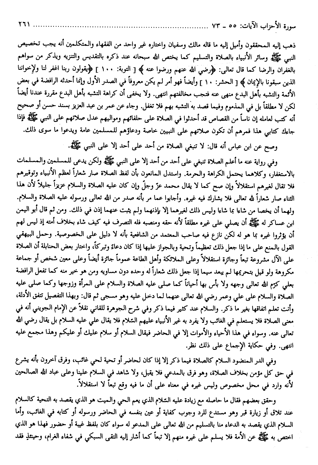 ولهما أن يخصا من شاءا بما شاءا وليس ذلك لغيرهما إلا بإذنهما ولم يثبت عنهما إذن في ذلك. ومن ثم قال أبو اليمن ابن عساكر له صلّى الله عليه وسلم أن يصلي على غيره مطلقا لأنه حقه ومنصبه فله التصرف فيه كيف شاء بخلاف أمته إذ ليس لهم أن يؤثروا غيره بما هو له لكن نازع فيه صاحب المعتمد من الشافعية بأنه لا دليل على الخصوصية. وحمل البيهقي القول بالمنع على ما إذا جعل ذلك تعظيما وتحية وبالجواز عليها إذا كان دعاء وتبركا، واختار بعض الحنابلة أن الصلاة على الآل مشروعة تبعا وجائزة استقلالا وعلى الملائكة وأهل الطاعة عموما جائزة أيضا وعلى معين شخص أو جماعة مكروهة ولو قيل بتحريمها لم يبعد سيما إذا جعل ذلك شعارا له وحده دون مساويه ومن هو خير منه كما تفعل الرافضة بعلي كرّم الله تعالى وجهه ولا بأس بها أحيانا كما صلى عليه الصلاة والسلام على المرأة وزوجها وكما صلى عليه الصلاة والسلام على علي وعمر رضي الله تعالى عنهما لما دخل عليه وهو مسجى ثم قال: وبهذا التفصيل تتفق الأدلة، وأنت تعلم اتفاقها بغير ما ذكر. والسلام عند كثير فيما ذكر وفي شرح الجوهرة للقاني نقلا عن الإمام الجويني أنه في معنى الصلاة فلا يستعلم في الغائب ولا يفرد به غير الأنبياء عليهم السّلام فلا يقال علي عليه السّلام بل يقال رضي الله تعالى عنه. وسواء في هذا الأحياء والأموات إلا في الحاضر فيقال السّلام أو سلام عليك أو عليكم وهذا مجمع عليه انتهى. وفي حكاية الإجماع على ذلك نظر.