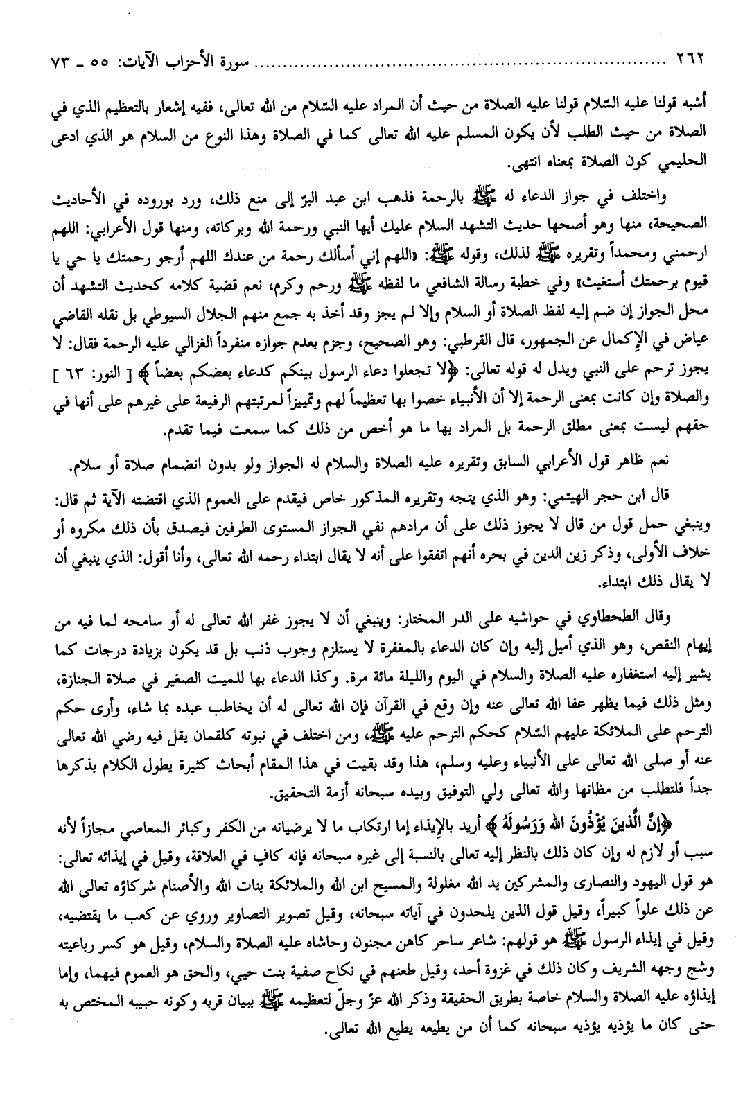 وفي خطبة رسالة الشافعي ما لفظه صلّى الله عليه وسلم ورحم وكرم، نعم قضية كلامه كحديث التشهد أن محل الجواز إن ضم إليه لفظ الصلاة أو السّلام وإلا لم يجز وقد أخذ به جمع منهم الجلال السيوطي بل نقله القاضي عياض في الإكمال عن الجمهور، قال القرطبي: وهو الصحيح، وجزم بعدم جوازه منفردا الغزالي عليه الرحمة فقال: لا يجوز ترحم على النبي ويدل له قوله تعالى: لا تَجْعَلُوا دُعاءَ الرَّسُولِ بَيْنَكُمْ كَدُعاءِ بَعْضِكُمْ بَعْضاً [النور: 63] والصلاة وإن كانت بمعنى الرحمة إلا أن الأنبياء خصوا بها تعظيما لهم وتمييزا لمرتبتهم الرفيعة على غيرهم على أنها في حقهم ليست بمعنى مطلق الرحمة بل المراد بها ما هو أخص من ذلك كما سمعت فيما تقدم.