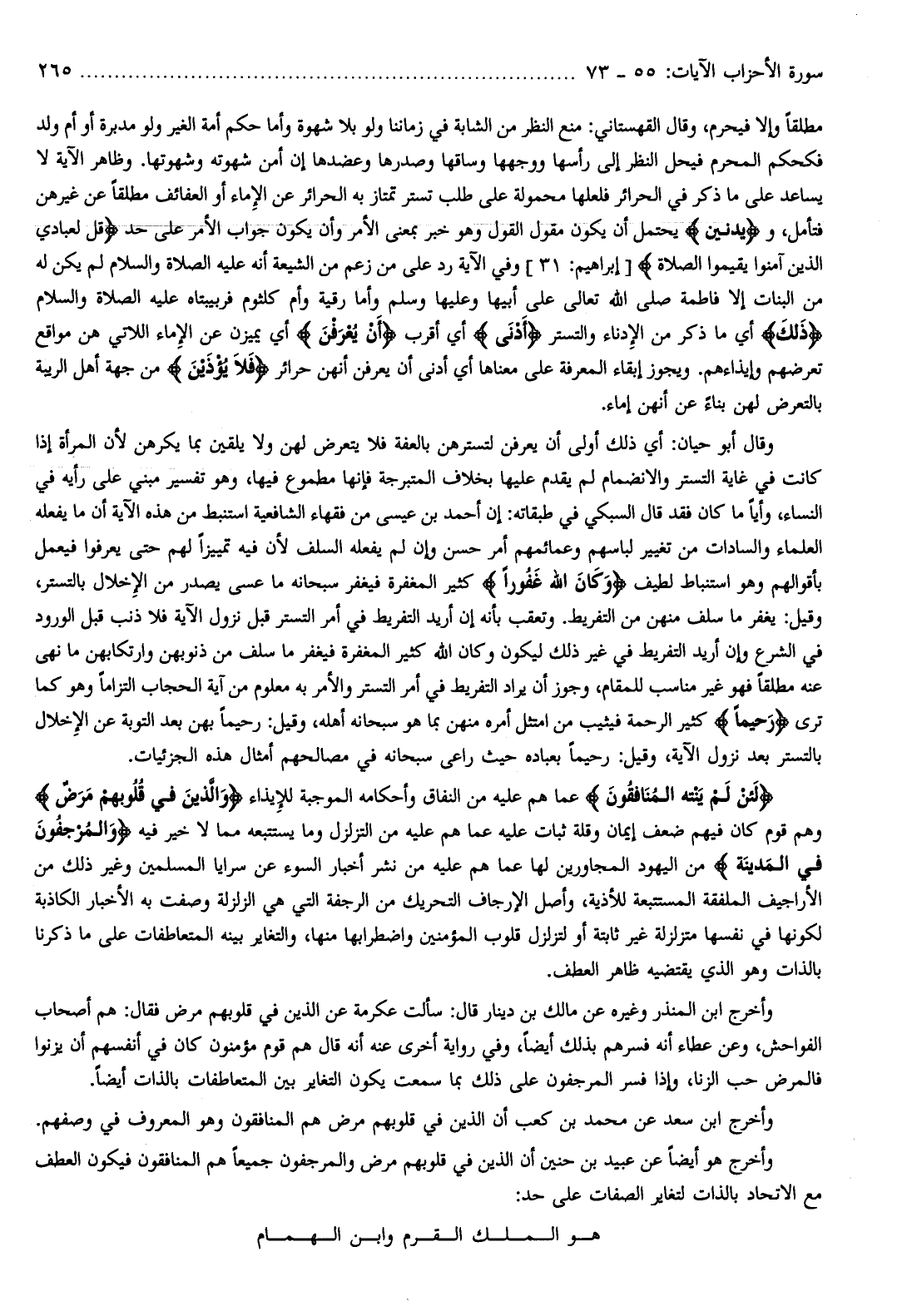 وأخرج ابن المنذر وغيره عن مالك بن دينار قال: سألت عكرمة عن الذين في قلوبهم مرض فقال: هم أصحاب الفواحش، وعن عطاء أنه فسرهم بذلك أيضا، وفي رواية أخرى عنه أنه قال هم قوم مؤمنون كان في أنفسهم أن يزنوا فالمرض حب الزنا، وإذا فسر المرجفون على ذلك بما سمعت يكون التغاير بين المتعاطفات بالذات أيضا.