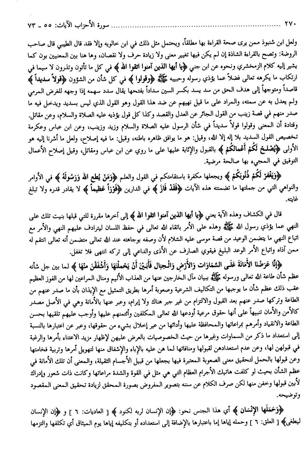 إِنَّا عَرَضْنَا الْأَمانَةَ عَلَى السَّماواتِ وَالْأَرْضِ وَالْجِبالِ فَأَبَيْنَ أَنْ يَحْمِلْنَها وَأَشْفَقْنَ مِنْها لما بين جل شأنه عظم شأن طاعة الله تعالى ورسوله صلّى الله عليه وسلم ببيان مآل الخارجين عنها من العذاب الأليم ومنال المراعين لها من الفوز العظيم عقب ذلك عظم شأن ما يوجبها من التكاليف الشرعية وصعوبة أمرها بطريق التمثيل مع الإيذان بأن ما صدر عنهم من الطاعة وتركها صدر عنهم بعد القبول والالتزام من غير جبر هناك ولا إبرام، وعبر عنها بالأمانة وهي في الأصل مصدر كالأمن والأمان تنبيها على أنها حقوق مرعية أودعها الله تعالى المكلفين وائتمنهم عليها وأوجب عليهم تلقيها بحسن الطاعة والانقياد وأمرهم بمراعاتها والمحافظة عليها وأدائها من غير إخلال بشيء من حقوقها، وعبر عن اعتبارها بالنسبة إلى استعداد ما ذكر من السماوات وغيرها من حيث الخصوصيات بالعرض عليهن لإظهار مزيد الاعتناء بأمرها والرغبة في قبولهن لها، وعن عدم استعدادهن لقبولها ومنافاتها لما هن عليه بالإباء والإشفاق منها لتهويل أمرها وتربية فخامتها وعن قبولها بالحمل لتحقيق معنى الصعوبة المعتبرة فيها بجعلها من قبيل الأجسام الثقيلة، والمعنى أن تلك الأمانة في عظم الشأن بحيث لو كلفت هاتيك الأجرام العظام التي هي مثل في القوة والشدة مراعاتها وكانت ذات شعور وإدراك لأبين قبولها وخفن منها لكن صرف الكلام عن سننه بتصوير المفروض بصورة المحقق لزيادة تحقيق المعنى المقصود وتوضيحه.
