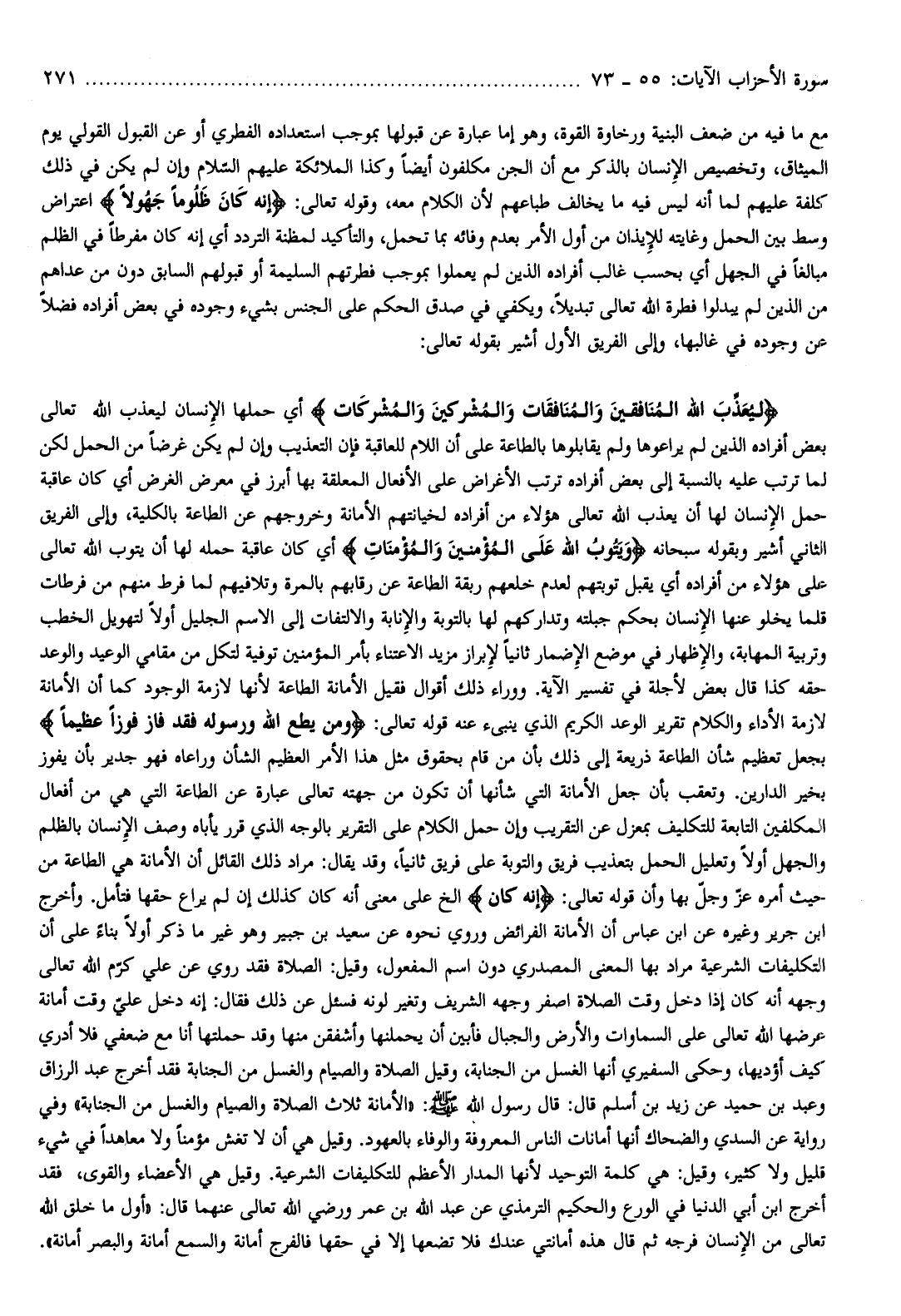 لِيُعَذِّبَ اللَّهُ الْمُنافِقِينَ وَالْمُنافِقاتِ وَالْمُشْرِكِينَ وَالْمُشْرِكاتِ أي حملها الإنسان ليعذب الله تعالى بعض أفراده الذين لم يراعوها ولم يقابلوها بالطاعة على أن اللام للعاقبة فإن التعذيب وإن لم يكن غرضا من الحمل لكن لما ترتب عليه بالنسبة إلى بعض أفراده ترتب الأغراض على الأفعال المعلقة بها أبرز في معرض الغرض أي كان عاقبة حمل الإنسان لها أن يعذب الله تعالى هؤلاء من أفراده لخيانتهم الأمانة وخروجهم عن الطاعة بالكلية، وإلى الفريق الثاني أشير وبقوله سبحانه وَيَتُوبَ اللَّهُ عَلَى الْمُؤْمِنِينَ وَالْمُؤْمِناتِ أي كان عاقبة حمله لها أن يتوب الله تعالى على هؤلاء من أفراده أي يقبل توبتهم لعدم خلعهم ربقة الطاعة عن رقابهم بالمرة وتلافيهم لما فرط منهم من فرطات قلما يخلو عنها الإنسان بحكم جبلته وتداركهم لها بالتوبة والإنابة والالتفات إلى الاسم الجليل أولا لتهويل الخطب وتربية المهابة، والإظهار في موضع الإضمار ثانيا لإبراز مزيد الاعتناء بأمر المؤمنين توفية لتكل من مقامي الوعيد والوعد حقه كذا قال بعض لأجلة في تفسير الآية. ووراء ذلك أقوال فقيل الأمانة الطاعة لأنها لازمة الوجود كما أن الأمانة لازمة الأداء والكلام تقرير الوعد الكريم الذي ينبىء عنه قوله تعالى: وَمَنْ يُطِعِ اللَّهَ وَرَسُولَهُ فَقَدْ فازَ فَوْزاً عَظِيماً بجعل تعظيم شأن الطاعة ذريعة إلى ذلك بأن من قام بحقوق مثل هذا الأمر العظيم الشأن وراعاه فهو جدير بأن يفوز بخير الدارين. وتعقب بأن جعل الأمانة التي شأنها أن تكون من جهته تعالى عبارة عن الطاعة التي هي من أفعال المكلفين التابعة للتكليف بمعزل عن التقريب وإن حمل الكلام على التقرير بالوجه الذي قرر يأباه وصف الإنسان بالظلم والجهل أولا وتعليل الحمل بتعذيب فريق والتوبة على فريق ثانيا، وقد يقال: مراد ذلك القائل أن الأمانة هي الطاعة من حيث أمره عزّ وجلّ بها وأن قوله تعالى: إِنَّهُ كانَ إلخ على معنى أنه كان كذلك إن لم يراع حقها فتأمل. وأخرج ابن جرير وغيره عن ابن عباس أن الأمانة الفرائض وروي نحوه عن سعيد بن جبير وهو غير ما ذكر أولا بناء على أن التكليفات الشرعية مراد بها المعنى المصدري دون اسم المفعول، وقيل: الصلاة
