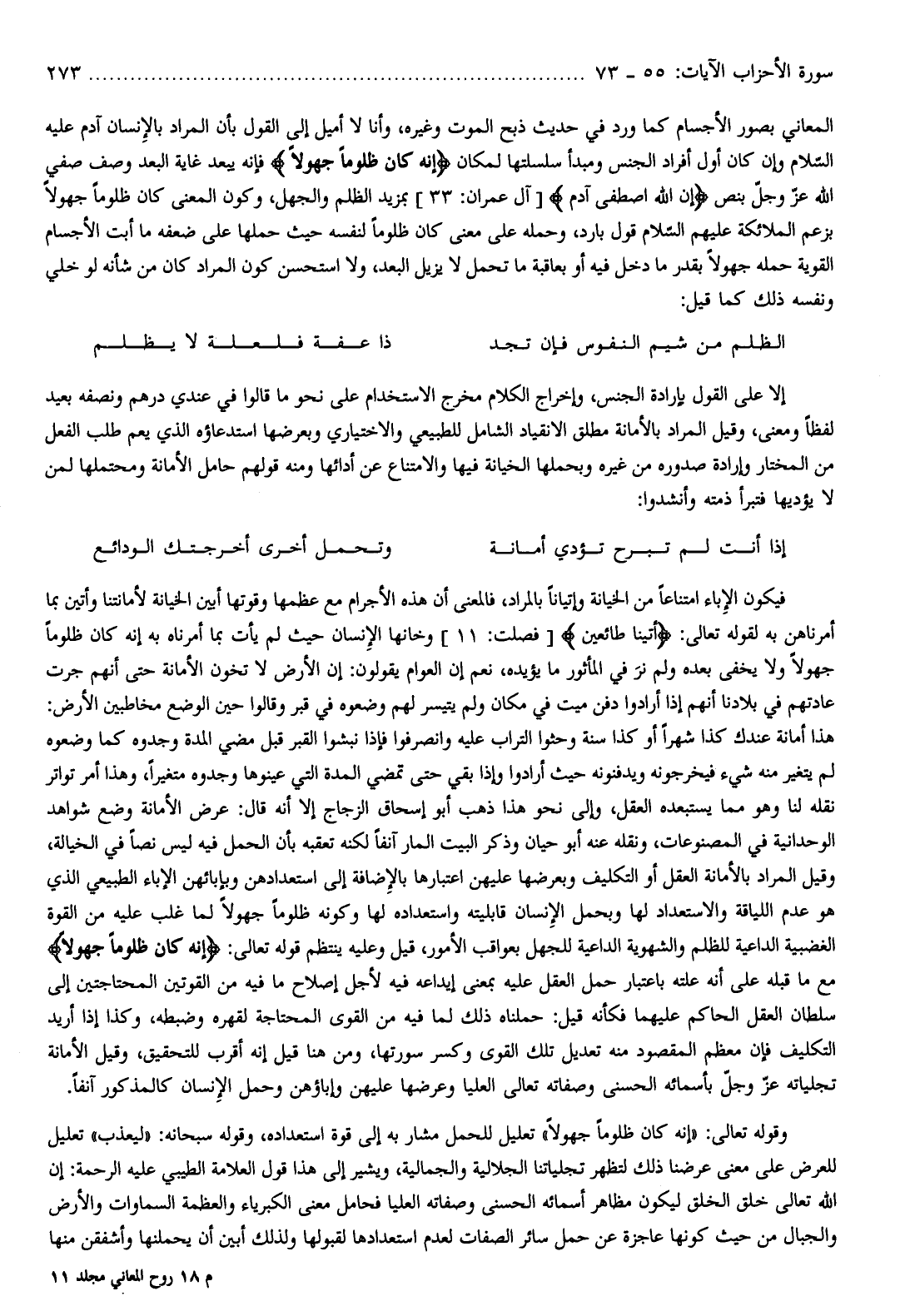 هذا أمانة عندك كذا شهرا أو كذا سنة وحثوا التراب عليه وانصرفوا فإذا نبشوا القبر قبل مضي المدة وجدوه كما وضعوه لم يتغير منه شيء فيخرجونه ويدفنونه حيث أرادوا وإذا بقي حتى تمضي المدة التي عينوها وجدوه متغيرا، وهذا أمر تواتر نقله لنا وهو مما يستبعده العقل، وإلى نحو هذا ذهب أبو إسحاق الزجاج إلا أنه قال: عرض الأمانة وضع شواهد الوحدانية في المصنوعات، ونقله عنه أبو حيان وذكر البيت المار آنفا لكنه تعقبه بأن الحمل فيه ليس نصا في الخيالة، وقيل المراد بالأمانة العقل أو التكليف وبعرضها عليهن اعتبارها بالإضافة إلى استعدادهن وبإبائهن الإباء الطبيعي الذي هو عدم اللياقة والاستعداد لها وبحمل الإنسان قابليته واستعداده لها وكونه ظلوما جهولا لما غلب عليه من القوة الغضبية الداعية للظلم والشهوية الداعية للجهل بعواقب الأمور، قيل وعليه ينتظم قوله تعالى: إِنَّهُ كانَ ظَلُوماً جَهُولًا مع ما قبله على أنه علته باعتبار حمل العقل عليه بمعنى إيداعه فيه لأجل إصلاح ما فيه من القوتين المحتاجتين إلى سلطان العقل الحاكم عليهما فكأنه قيل: حملناه ذلك لما فيه من القوى المحتاجة لقهره وضبطه، وكذا إذا أريد التكليف فإن معظم المقصود منه تعديل تلك القوى وكسر سورتها، ومن هنا قيل إنه أقرب للتحقيق، وقيل الأمانة تجلياته عزّ وجلّ بأسمائه الحسنى وصفاته تعالى العليا وعرضها عليهن وإباؤهن وحمل الإنسان كالمذكور آنفا.