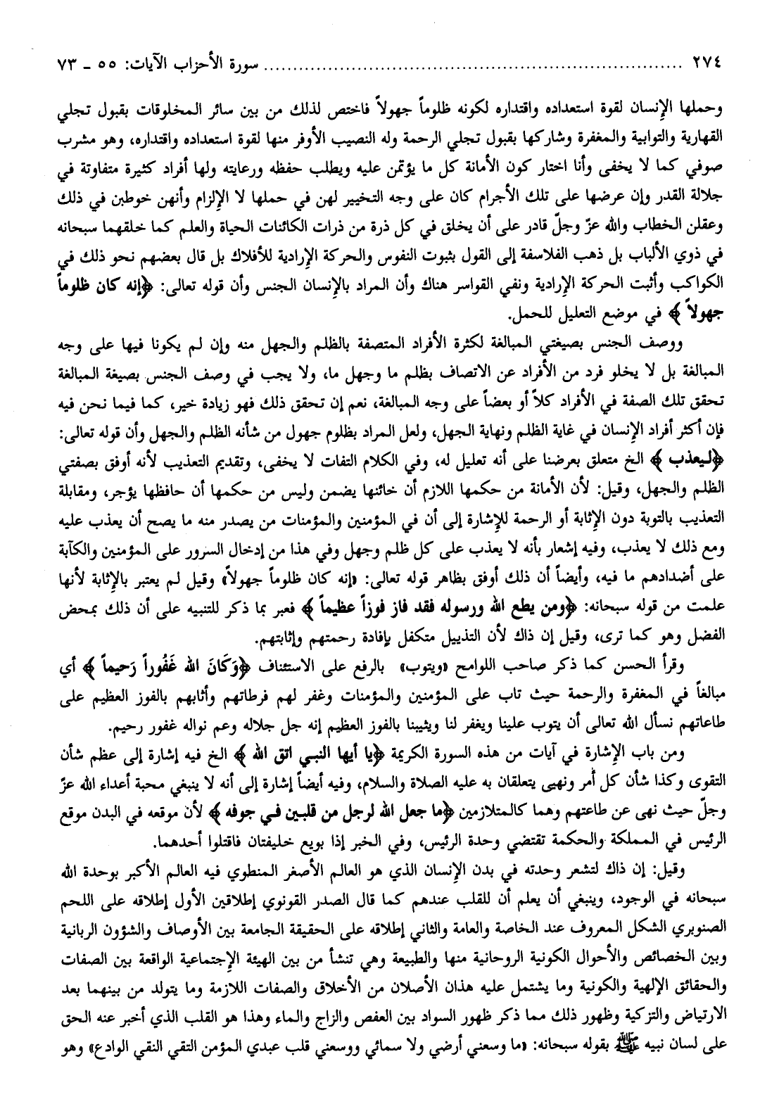 ووصف الجنس بصيغتي المبالغة لكثرة الأفراد المتصفة بالظلم والجهل منه وإن لم يكونا فيها على وجه المبالغة بل لا يخلو فرد من الأفراد عن الاتصاف بظلم ما وجهل ما، ولا يجب في وصف الجنس بصيغة المبالغة تحقق تلك الصفة في الأفراد كلا أو بعضا على وجه المبالغة، نعم إن تحقق ذلك فهو زيادة خير، كما فيما نحن فيه فإن أكثر أفراد الإنسان في غاية الظلم ونهاية الجهل، ولعل المراد بظلوم جهول من شأنه الظلم والجهل وأن قوله تعالى: