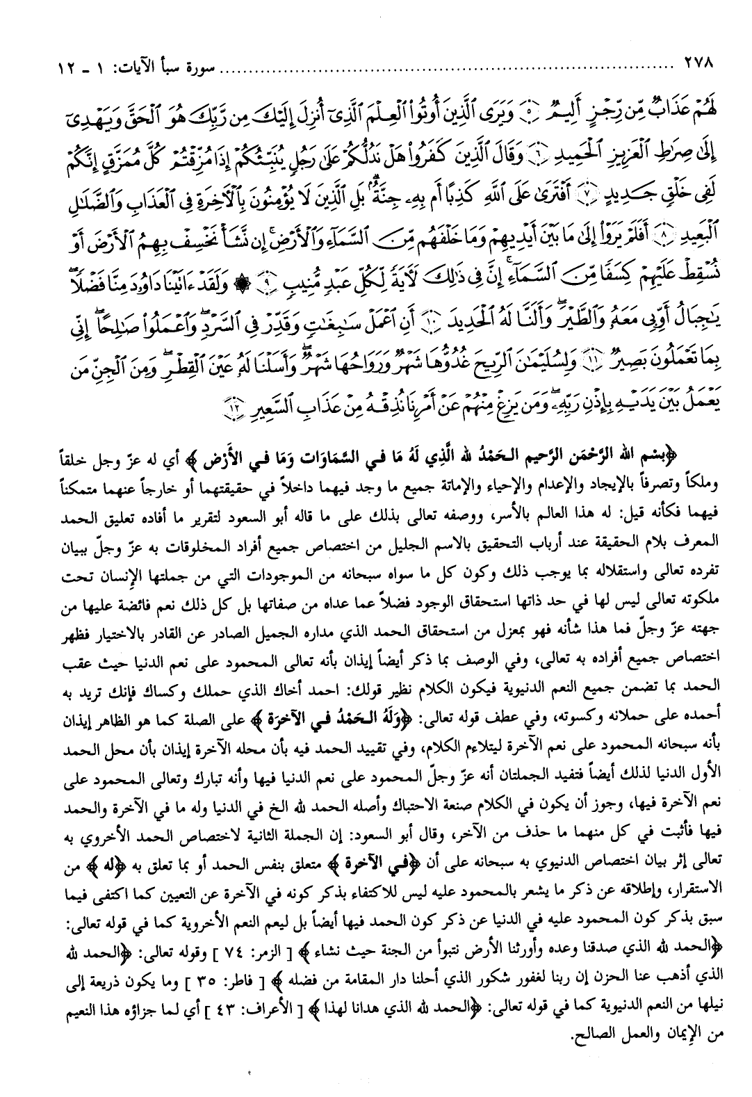 بِسْمِ اللَّهِ الرَّحْمنِ الرَّحِيمِ الْحَمْدُ لِلَّهِ الَّذِي لَهُ ما فِي السَّماواتِ وَما فِي الْأَرْضِ أي له عزّ وجلّ خلقا وملكا وتصرفا بالإيجاد والإعدام والإحياء والإماتة جميع ما وجد فيهما داخلا في حقيقتهما أو خارجا عنهما متمكنا فيهما فكأنه قيل: له هذا العالم بالأسر، ووصفه تعالى بذلك على ما قاله أبو السعود لتقرير ما أفاده تعليق الحمد المعرف بلام الحقيقة عند أرباب التحقيق بالاسم الجليل من اختصاص جميع أفراد المخلوقات به عزّ وجلّ ببيان تفرده تعالى واستقلاله بما يوجب ذلك وكون كل ما سواه سبحانه من الموجودات التي من جملتها الإنسان تحت ملكوته تعالى ليس لها في حد ذاتها استحقاق الوجود فضلا عما عداه من صفاتها بل كل ذلك نعم فائضة عليها من جهته عزّ وجلّ فما هذا شأنه فهو بمعزل من استحقاق الحمد الذي مداره الجميل الصادر عن القادر بالاختيار فظهر اختصاص جميع أفراده به تعالى، وفي الوصف بما ذكر أيضا إيذان بأنه تعالى المحمود على نعم الدنيا حيث عقب الحمد بما تضمن جميع النعم الدنيوية فيكون الكلام نظير قولك: احمد أخاك الذي حملك وكساك فإنك تريد به أحمده على حملانه وكسوته، وفي عطف قوله تعالى: وَلَهُ الْحَمْدُ فِي الْآخِرَةِ على الصلة كما هو الظاهر إيذان بأنه سبحانه المحمود على نعم الآخرة ليتلاءم الكلام، وفي تقييد الحمد فيه بأن محله الآخرة إيذان بأن محل الحمد الأول الدنيا لذلك أيضا فتفيد الجملتان أنه عزّ وجلّ المحمود على نعم الدنيا فيها وأنه تبارك وتعالى المحمود على نعم الآخرة فيها، وجوز أن يكون في الكلام صنعة الاحتباك وأصله الحمد لله إلخ في الدنيا وله ما في الآخرة والحمد فيها فأثبت في كل منهما ما حذف من الآخر، وقال أبو السعود: إن الجملة الثانية لاختصاص الحمد الأخروي به تعالى إثر بيان اختصاص الدنيوي به سبحانه على أن فِي الْآخِرَةِ متعلق بنفس الحمد أو بما تعلق به لَهُ من الاستقرار، وإطلاقه عن ذكر ما يشعر بالمحمود عليه ليس للاكتفاء بذكر كونه في الآخرة عن التعيين كما اكتفى فيما سبق بذكر كون المحمود عليه في الدنيا عن ذكر كون الحمد فيها أيضا بل ليعم النعم الأخروية كما في قوله تعالى: