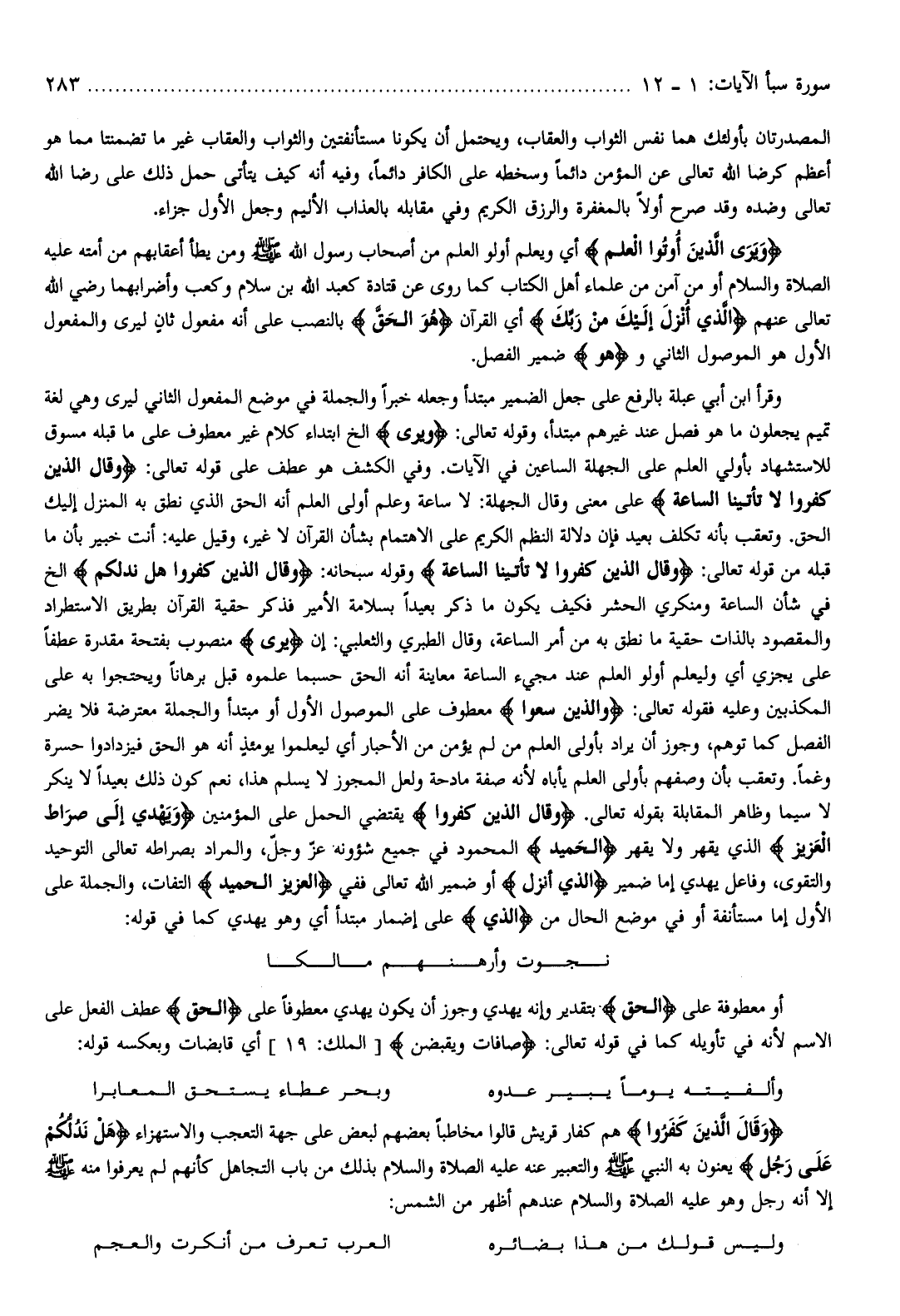وقرأ ابن أبي عبلة بالرفع على جعل الضمير مبتدأ وجعله خبرا والجملة في موضع المفعول الثاني ليرى وهي لغة تميم يجعلون ما هو فصل عند غيرهم مبتدأ، وقوله تعالى: وَيَرَى إلخ ابتداء كلام غير معطوف على ما قبله مسوق للاستشهاد بأولي العلم على الجهلة الساعين في الآيات. وفي الكشف هو عطف على قوله تعالى: وَقالَ الَّذِينَ كَفَرُوا لا تَأْتِينَا السَّاعَةُ على معنى وقال الجهلة: لا ساعة وعلم أولى العلم أنه الحق الذي نطق به المنزل إليك الحق. وتعقب بأنه تكلف بعيد فإن دلالة النظم الكريم على الاهتمام بشأن القرآن لا غير، وقيل عليه: أنت خبير بأن ما قبله من قوله تعالى: وَقالَ الَّذِينَ كَفَرُوا لا تَأْتِينَا السَّاعَةُ وقوله سبحانه: وَقالَ الَّذِينَ كَفَرُوا هَلْ نَدُلُّكُمْ إلخ في شأن الساعة ومنكري الحشر فكيف يكون ما ذكر بعيدا بسلامة الأمير فذكر حقية القرآن بطريق الاستطراد والمقصود بالذات حقية ما نطق به من أمر الساعة، وقال الطبري والثعلبي: إن يَرَى منصوب بفتحة مقدرة عطفا على يجزي أي وليعلم أولو العلم عند مجيء الساعة معاينة أنه الحق حسبما علموه قبل برهانا ويحتجوا به على المكذبين وعليه فقوله تعالى: وَالَّذِينَ سَعَوْا معطوف على الموصول الأول أو مبتدأ والجملة معترضة فلا يضر الفصل كما توهم، وجوز أن يراد بأولى العلم من لم يؤمن من الأحبار أي ليعلموا يومئذ أنه هو الحق فيزدادوا حسرة وغما. وتعقب بأن وصفهم بأولى العلم يأباه لأنه صفة مادحة ولعل المجوز لا يسلم هذا، نعم كون ذلك بعيدا لا ينكر لا سيما وظاهر المقابلة بقوله تعالى: وَقالَ الَّذِينَ كَفَرُوا يقتضي الحمل على المؤمنين وَيَهْدِي إِلى صِراطِ الْعَزِيزِ الذي يقهر ولا يقهر الْحَمِيدِ المحمود في جميع شؤونه عزّ وجلّ، والمراد بصراطه تعالى التوحيد والتقوى، وفاعل يهدي إما ضمير الَّذِي أُنْزِلَ أو ضمير الله تعالى ففي الْعَزِيزِ الْحَمِيدِ التفات، والجملة على الأول إما مستأنفة أو في موضع الحال من الَّذِي على إضمار مبتدأ أي وهو يهدي كما في قوله: