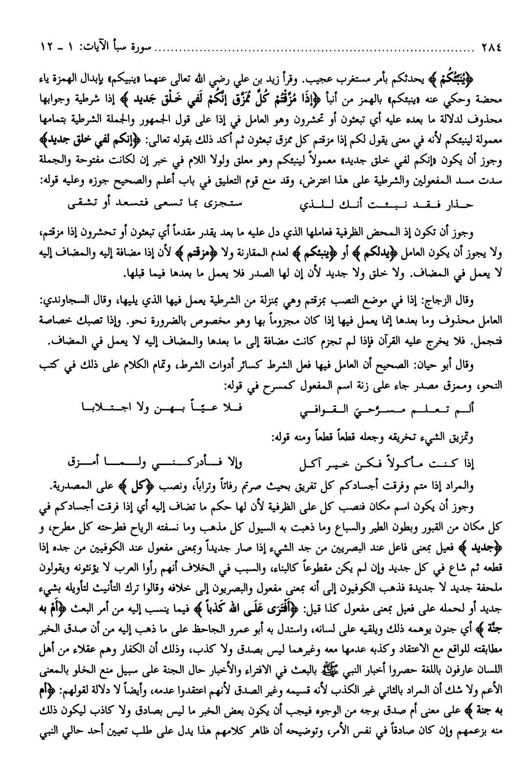 وجوز أن يكون اسم مكان فنصب كل على الظرفية لأن لها حكم ما تضاف إليه أي إذا فرقت أجسادكم في كل مكان من القبور وبطون الطير والسباع وما ذهبت به السيول كل مذهب وما نسفته الرياح فطرحته كل مطرح، وجَدِيدٍ فعيل بمعنى فاعل عند البصريين من جد الشيء إذا صار جديدا وبمعنى مفعول عند الكوفيين من جده إذا قطعه ثم شاع في كل جديد وإن لم يكن مقطوعا كالبناء، والسبب في الخلاف أنهم رأوا العرب لا يؤنثونه ويقولون ملحفة جديد لا جديدة فذهب الكوفيون إلى أنه بمعنى مفعول والبصريون إلى خلافه وقالوا ترك التأنيث لتأويله بشيء جديد أو لحمله على فعيل بمعنى مفعول كذا قيل: أَفْتَرى عَلَى اللَّهِ كَذِباً فيما ينسب إليه من أمر البعث أَمْ بِهِ جِنَّةٌ أي جنون يوهمه ذلك ويلقيه على لسانه، واستدل به أبو عمرو الجاحظ على ما ذهب إليه من أن صدق الخبر مطابقته للواقع مع الاعتقاد وكذبه عدمها معه وغيرهما ليس بصدق ولا كذب، وذلك أن الكفار وهم عقلاء من أهل اللسان عارفون باللغة حصروا أخبار النبي صلّى الله عليه وسلم بالبعث في الافتراء والأخبار حال الجنة على سبيل منع الخلو بالمعنى الأعم ولا شك أن المراد بالثاني غير الكذب لأنه قسيمه وغير الصدق لأنهم اعتقدوا عدمه، وأيضا لا دلالة لقولهم: أَمْ بِهِ جِنَّةٌ على معنى أم صدق بوجه من الوجوه فيجب أن يكون بعض الخبر ما ليس بصادق ولا كاذب ليكون ذلك منه بزعمهم وإن كان صادقا في نفس الأمر، وتوضيحه أن ظاهر كلامهم هذا يدل على طلب تعيين أحد حالي النبي