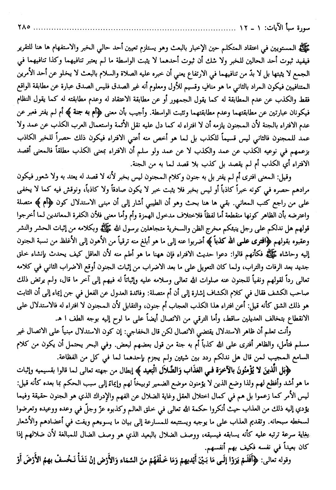 صلّى الله عليه وسلم المستويين في اعتقاد المتكلم حين الإخبار بالبعث وهو يستلزم تعيين أحد حالي الخبر والاستفهام هاهنا للتقرير فيفيد ثبوت أحد الحالين للخبر ولا شك أن ثبوت أحدهما لا يثبت الواسطة ما لم يعتبر تنافيهما وكذا تنافيهما في الجمع لا يثبتها بل لا بدّ من تنافيهما في الارتفاع يعني أن خبره عليه الصلاة والسلام بالبعث لا يخلو عن أحد الأمرين المتنافيين فيكون المراد بالثاني ما هو مناف وقسيم للأول ومعلوم أنه غير الصدق فليس الصدق عبارة عن مطابقة الواقع فقط والكذب عن عدم المطابقة له كما يقول الجمهور أو عن مطابقة الاعتقاد له وعدم مطابقته له كما يقول النظام فيكونان عبارتين عن مطابقتهما وعدم مطابقتهما وتثبت الواسطة. وأجيب بأن معنى أَمْ بِهِ جِنَّةٌ أم لم يفتر فعبر عن عدم الافتراء بالجنة لأن المجنون يلزمه أن لا افتراء له كما دل عليه نقل الأئمة واستعمال العرب الكذب عن عمد ولا عمد للمجنون فالثاني ليس قسيما للكذب بل لما هو أخص منه أعني الافتراء فيكون ذلك حصرا للخبر الكاذب بزعمهم في نوعيه الكذب عن عمد والكذب لا عن عمد ولو سلم أن الافتراء بمعنى الكذب مطلقا فالمعنى أقصد الافتراء أي الكذب أم لم يقصد بل كذب بلا قصد لما به من الجنة.