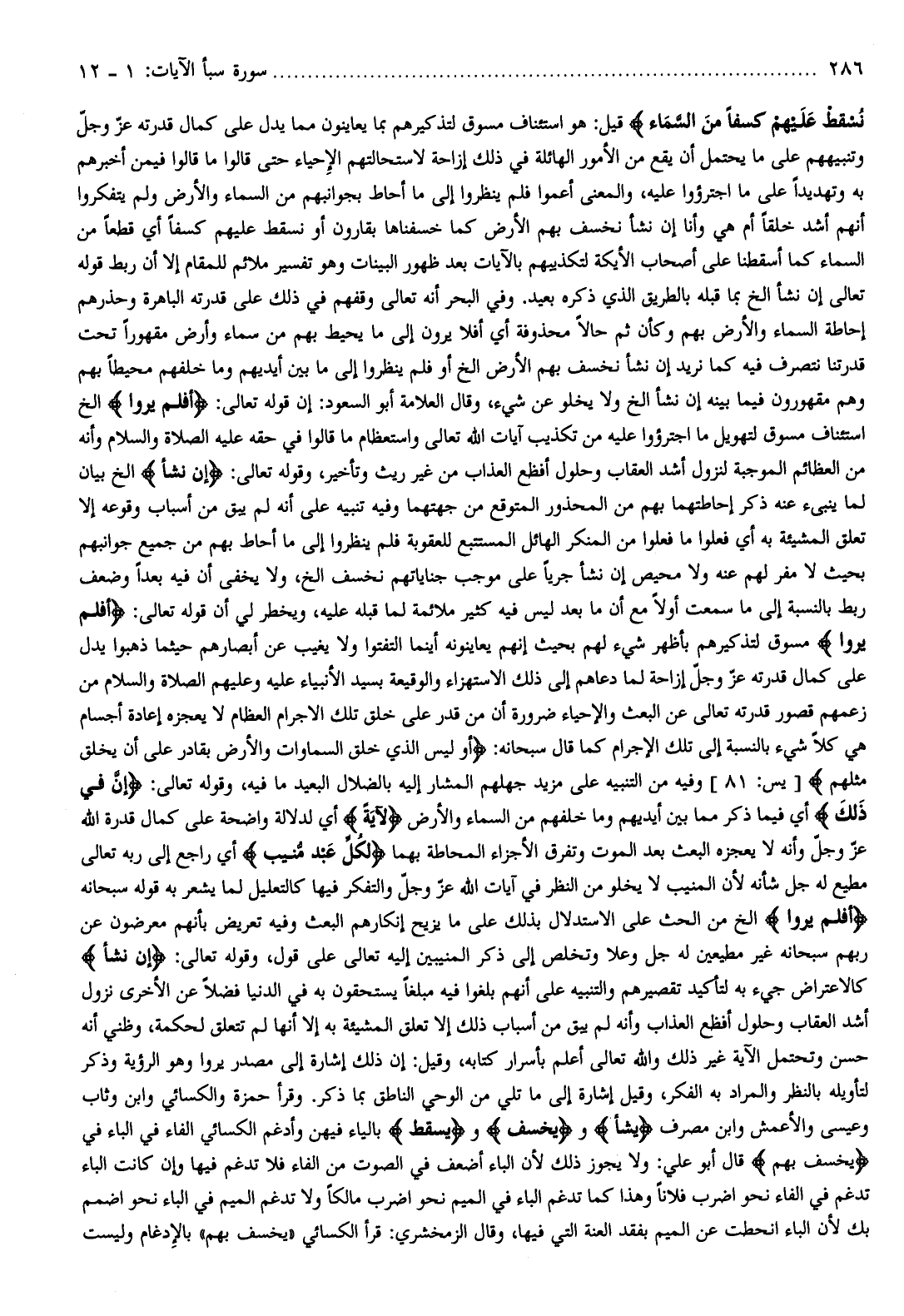 قيل: هو استئناف مسوق لتذكيرهم بما يعاينون مما يدل على كمال قدرته عزّ وجلّ وتنبيههم على ما يحتمل أن يقع من الأمور الهائلة في ذلك إزاحة لاستحالتهم الإحياء حتى قالوا ما قالوا فيمن أخبرهم به وتهديدا على ما اجترءوا عليه، والمعنى أعموا فلم ينظروا إلى ما أحاط بجوانبهم من السماء والأرض ولم يتفكروا أنهم أشد خلقا أم هي وأنا إن نشأ نخسف بهم الأرض كما خسفناها بقارون أو نسقط عليهم كسفا أي قطعا من السماء كما أسقطنا على أصحاب الأيكة لتكذيبهم بالآيات بعد ظهور البينات وهو تفسير ملائم للمقام إلا أن ربط قوله تعالى إن نشأ إلخ بما قبله بالطريق الذي ذكره بعيد. وفي البحر أنه تعالى وقفهم في ذلك على قدرته الباهرة وحذرهم إحاطة السماء والأرض بهم وكأن ثم حالا محذوفة أي أفلا يرون إلى ما يحيط بهم من سماء وأرض مقهورا تحت قدرتنا نتصرف فيه كما نريد إن نشأ نخسف بهم الأرض إلخ أو فلم ينظروا إلى ما بين أيديهم وما خلفهم محيطا بهم وهم مقهورون فيما بينه إن نشأ إلخ ولا يخلو عن شيء، وقال العلامة أبو السعود: إن قوله تعالى: أَفَلَمْ يَرَوْا إلخ استئناف مسوق لتهويل ما اجترءوا عليه من تكذيب آيات الله تعالى واستعظام ما قالوا في حقه عليه الصلاة والسلام وأنه من العظائم الموجبة لنزول أشد العقاب وحلول أفظع العذاب من غير ريث وتأخير، وقوله تعالى: إِنْ نَشَأْ إلخ بيان لما ينبىء عنه ذكر إحاطتهما بهم من المحذور المتوقع من جهتهما وفيه تنبيه على أنه لم يبق من أسباب وقوعه إلا تعلق المشيئة به أي فعلوا ما فعلوا من المنكر الهائل المستتبع للعقوبة فلم ينظروا إلى ما أحاط بهم من جميع جوانبهم بحيث لا مفر لهم عنه ولا محيص إن نشأ جريا على موجب جناياتهم نخسف إلخ، ولا يخفى أن فيه بعدا وضعف ربط بالنسبة إلى ما سمعت أولا مع أن ما بعد ليس فيه كثير ملائمة لما قبله عليه، ويخطر لي أن قوله تعالى: أَفَلَمْ يَرَوْا مسوق لتذكيرهم بأظهر شيء لهم بحيث إنهم يعاينونه أينما التفتوا ولا يغيب عن أبصارهم حيثما ذهبوا يدل على كمال قدرته عزّ وجلّ إزاحة لما دعاهم إلى ذلك الاستهزاء والوقيعة بسيد الأنبياء عليه وعليهم الصلاة والسلام من زعمهم قصور قدرته تعالى عن البعث والإحياء ضرورة أن من قدر على خلق تلك الاجرام العظام لا يعجزه إعادة أجسام هي كلا شيء بالنسبة إلى تلك الإجرام كما قال سبحانه: أَوَلَيْسَ الَّذِي خَلَقَ السَّماواتِ وَالْأَرْضَ بِقادِرٍ عَلى أَنْ يَخْلُقَ مِثْلَهُمْ [يس: 81] وفيه من التنبيه على مزيد جهلهم المشار إليه بالضلال البعيد ما فيه، وقوله تعالى: إِنَّ فِي ذلِكَ أي فيما ذكر مما بين أيديهم وما خلفهم من السماء والأرض لَآيَةً أي لدلالة واضحة على كمال قدرة الله عزّ وجلّ وأنه لا يعجزه البعث بعد الموت وتفرق الأجزاء المحاطة بهما لِكُلِّ عَبْدٍ مُنِيبٍ أي راجع إلى ربه تعالى مطيع له جل شأنه لأن المنيب لا يخلو من النظر في آيات الله عزّ وجلّ والتفكر فيها كالتعليل لما يشعر به قوله سبحانه أَفَلَمْ يَرَوْا إلخ من الحث على الاستدلال بذلك على ما يزيح إنكارهم البعث وفيه تعريض بأنهم معرضون عن ربهم سبحانه غير مطيعين له جل وعلا وتخلص إلى ذكر المنيبين إليه تعالى على قول، وقوله تعالى: إِنْ نَشَأْ كالاعتراض جيء به لتأكيد تقصيرهم والتنبيه على أنهم بلغوا فيه مبلغا يستحقون به في الدنيا فضلا عن الأخرى نزول أشد العقاب وحلول أفظع العذاب وأنه لم يبق من أسباب ذلك إلا تعلق المشيئة به إلا أنها لم تتعلق لحكمة، وظني أنه حسن وتحتمل الآية غير ذلك والله تعالى أعلم بأسرار كتابه، وقيل: إن ذلك إشارة إلى مصدر يروا وهو الرؤية وذكر لتأويله بالنظر والمراد به الفكر، وقيل إشارة إلى ما تلي من الوحي الناطق بما ذكر. وقرأ حمزة والكسائي وابن وثاب وعيسى والأعمش وابن مصرف يشأ ويخسف ويسقط بالياء فيهن وأدغم الكسائي الفاء في الباء في يخسف بهم قال أبو علي: ولا
