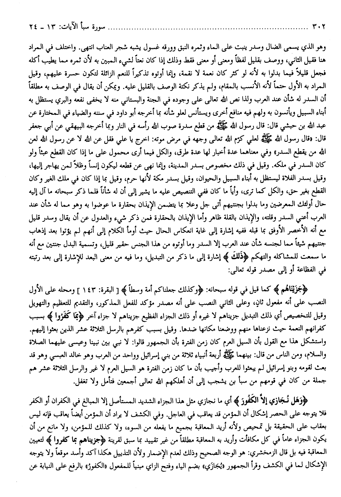 وفي معناهما عدة أخبار لها عدة طرق، والكل فيما أرى محمول على ما إذا كان القطع عبثا ولو كان السدر في ملكه. وقيل في ذلك مخصوص بسدر المدينة، وإنما نهى عن قطعه ليكون إنسا وظلا لمن يهاجر إليها، وقيل بسدر الفلاة ليستظل به أبناء السبيل والحيوان، وقيل بسدر مكة لأنها حرم، وقيل بما إذا كان في ملك الغير وكان القطع بغير حق، والكل كما ترى، وأيا ما كان ففي التنصيص عليه ما يشير إلى أن له شأنا فلما ذكر سبحانه ما آل إليه حال أولئك المعرضين وما بدلوا بجنتيهم أتى جل وعلا بما يتضمن الإيذان بحقارة ما عوضوا به وهو مما له شأن عند العرب أعني السدر وقلته، والإيذان بالقلة ظاهر وأما الإيذان بالحقارة فمن ذكر شيء والعدول عن أن يقال وسدر قليل مع أنه الأخصر الأوفق بما قبله ففيه إشارة إلى غاية انعكاس الحال حيث أومأ الكلام إلى أنهم لم يؤتوا بعد إذهاب جنتيهم شيئا مما لجنسه شأن عند العرب إلا السدر وما أوتوه من هذا الجنس حقير قليل، وتسمية البدل جنتين مع أنه ما سمعت للمشاكلة والتهكم ذلِكَ إشارة إلى ما ذكر من التبديل، وما فيه من معنى البعد للإشارة إلى بعد رتبته في الفظاعة أو إلى مصدر قوله تعالى: