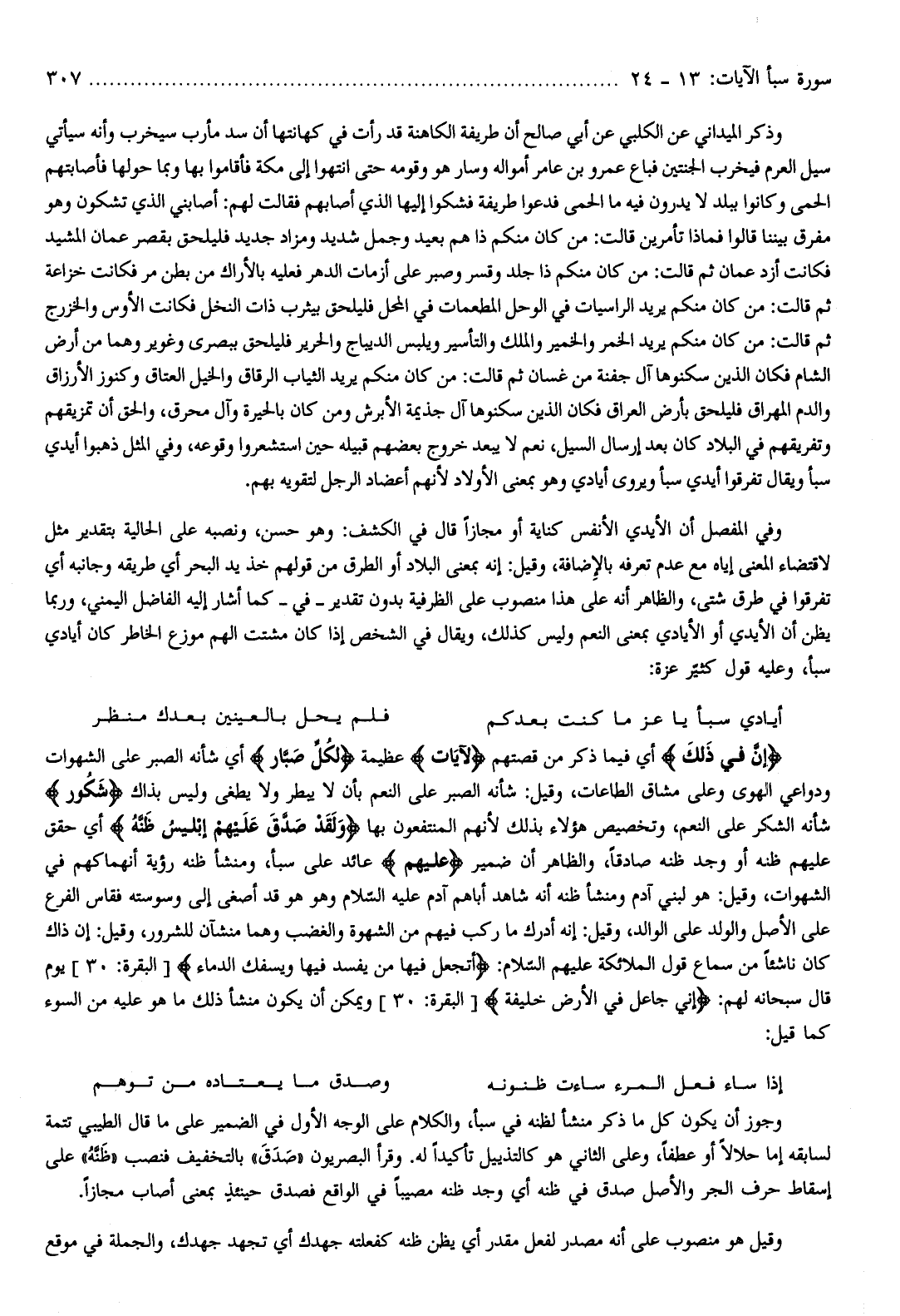 إِنَّ فِي ذلِكَ أي فيما ذكر من قصتهم لَآياتٍ عظيمة لِكُلِّ صَبَّارٍ أي شأنه الصبر على الشهوات ودواعي الهوى وعلى مشاق الطاعات، وقيل: شأنه الصبر على النعم بأن لا يبطر ولا يطغى وليس بذاك شَكُورٍ شأنه الشكر على النعم، وتخصيص هؤلاء بذلك لأنهم المنتفعون بها وَلَقَدْ صَدَّقَ عَلَيْهِمْ إِبْلِيسُ ظَنَّهُ أي حقق عليهم ظنه أو وجد ظنه صادقا، والظاهر أن ضمير عَلَيْهِمْ عائد على سبأ، ومنشأ ظنه رؤية انهماكهم في الشهوات، وقيل: هو لبني آدم ومنشأ ظنه أنه شاهد أباهم آدم عليه السّلام وهو هو قد أصغى إلى وسوسته فقاس الفرع على الأصل والولد على الوالد، وقيل: إنه أدرك ما ركب فيهم من الشهوة والغضب وهما منشآن للشرور، وقيل: إن ذاك كان ناشئا من سماع قول الملائكة عليهم السّلام: أَتَجْعَلُ فِيها مَنْ يُفْسِدُ فِيها وَيَسْفِكُ الدِّماءَ [البقرة: 30] يوم قال سبحانه لهم: إِنِّي جاعِلٌ فِي الْأَرْضِ خَلِيفَةً [البقرة: 30] ويمكن أن يكون منشأ ذلك ما هو عليه من السوء كما قيل: