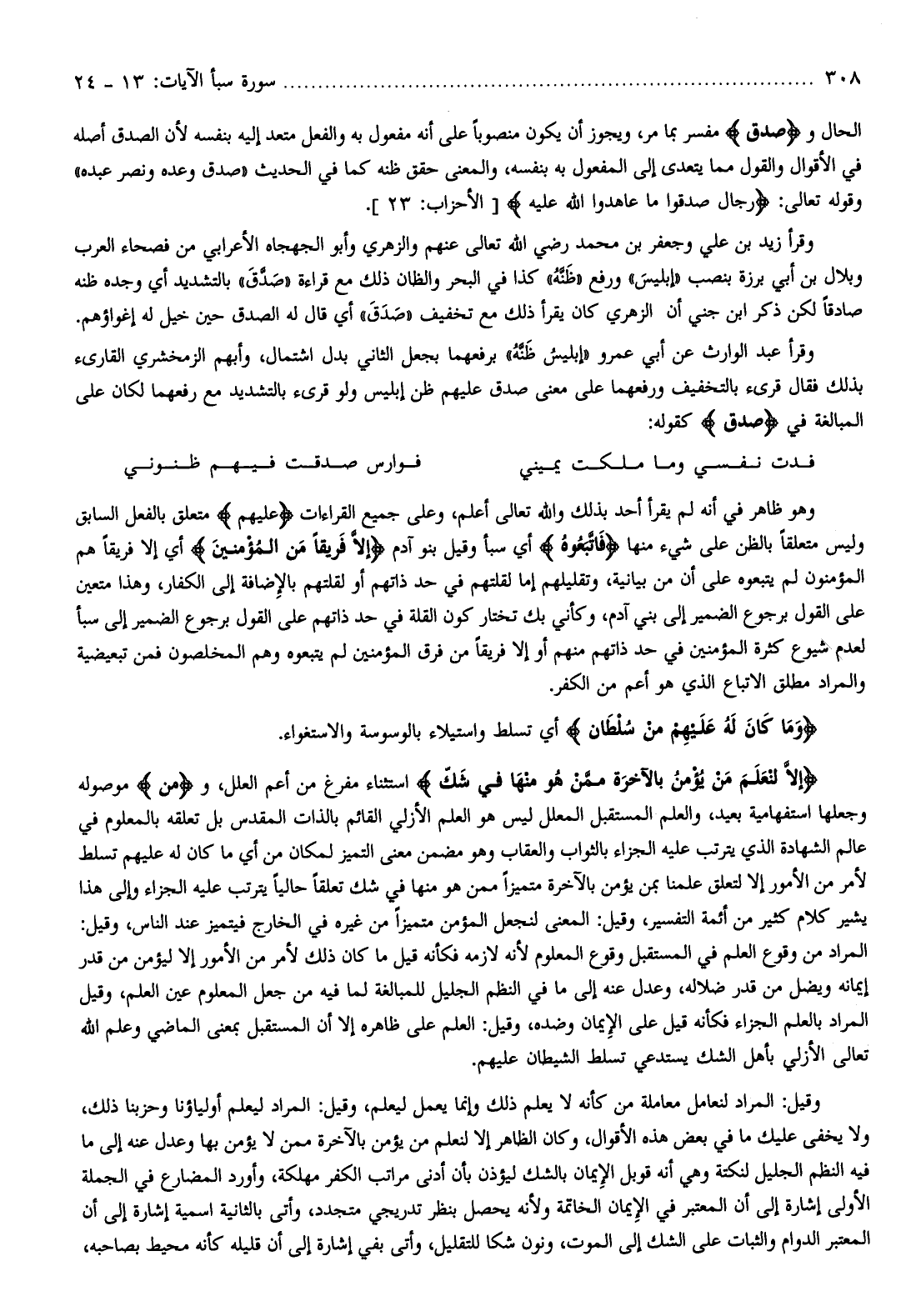 وهو ظاهر في أنه لم يقرأ أحد بذلك والله تعالى أعلم، وعلى جميع القراءات عَلَيْهِمْ متعلق بالفعل السابق وليس متعلقا بالظن على شيء منها فَاتَّبَعُوهُ أي سبأ وقيل بنو آدم إِلَّا فَرِيقاً مِنَ الْمُؤْمِنِينَ أي إلا فريقا هم المؤمنون لم يتبعوه على أن من بيانية، وتقليلهم إما لقلتهم في حد ذاتهم أو لقلتهم بالإضافة إلى الكفار، وهذا متعين على القول برجوع الضمير إلى بني آدم، وكأني بك تختار كون القلة في حد ذاتهم على القول برجوع الضمير إلى سبأ لعدم شيوع كثرة المؤمنين في حد ذاتهم منهم أو إلا فريقا من فرق المؤمنين لم يتبعوه وهم المخلصون فمن تبعيضية والمراد مطلق الاتباع الذي هو أعم من الكفر.