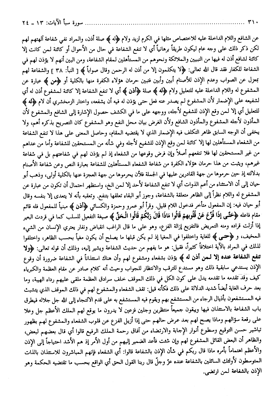 عن الشافع واللام الداخلة عليه للاختصاص مثلها في الكرم لزيد ولام لَهُ صلة أذن، والمراد نفي شفاعة آلهتهم لهم لكن ذكر ذلك على وجه عام ليكون طريقا برهانيا أي لا تنفع الشفاعة في حال من الأحوال أو كائنة لمن كانت إلا كائنة لشافع أذن له فيها من النبيين والملائكة ونحوهم من المستأهلين لمقام الشفاعة، ومن البين أنهم لا يؤذن لهم في الشفاعة للكفار فقد قال الله تعالى: لا يَتَكَلَّمُونَ إِلَّا مَنْ أَذِنَ لَهُ الرَّحْمنُ وَقالَ صَواباً [النبأ: 38] والشفاعة لهم بمعزل عن الصواب وعدم الإذن للأصنام أبين وأبين فتبين حرمان هؤلاء الكفرة منها بالكلية أو (من) عبارة عن المشفوع له واللام الداخلة عليه للتعليل ولام لَهُ صلة أَذِنَ أي لا تنفع الشفاعة إلا كائنة لمشفوع أذن له أي لشفيعه على الإضمار لأن المشفوع لم يصدر عنه فعل حتى يؤذن له فيه أن يشفعه، واختار الزمخشري أن لام لَهُ للتعليل أي إلا لمن وقع الإذن للشفيع لأجله، ووجهه على ما في الكشف حصول الإشارة إلى الشافع والمشفوع لأن المأذون لأجله المشفوع والمأذون الشافع ولأن الغرض بيان محل النفع وهو المشفوع كان التصريح بذكره أهم، ولا يخفى أن الوجه السابق ظاهر التكلف فيه الإضمار الذي لا يقتضيه المقام، وحاصل المعنى على هذا لا تنفع الشفاعة من الشفعاء المستأهلين لها إلا كائنة لمن وقع الإذن للشفيع لأجله وفي شأنه من المستحقين للشفاعة وأما من عداهم من غير المستحقين لها فلا تنفعهم أصلا وإن فرض وقوعها من الشفعاء إذ لم يؤذن لهم في شفاعتهم بل في شفاعة غيرهم، ويثبت من هذا حرمان هؤلاء الكفرة من شفاعة الشفعاء المستأهلين للشفاعة بعبارة النص وعن شفاعة الأصنام بدلالته إذ حين حرموها من جهة القادرين عليها في الجملة فلأن يحرموها من جهة العجزة عنها بالكلية أولى، وذهب أبو حيان إلى أن الاستثناء من أعم الذوات أي لا تنفع الشفاعة لأحد إلا لمن إلخ، واستظهر احتمال أن تكون من عبارة عن المشفوع له واللام نظرا إلى الظاهر متعلقة بالشفاعة، وجوز أبو البقاء تعلقها بتنفع. وتعقبه بأنه لا يتعدى إلا بنفسه وقال أبو حيان فيه: إن المفعول متأخر فدخول اللام قليل. وقرأ أبو عمرو وحمزة والكسائي أَذِنَ مبنيا للمفعول فله قائم مقام فاعله حَتَّى إِذا فُزِّعَ عَنْ قُلُوبِهِمْ قالُوا ماذا قالَ رَبُّكُمْ قالُوا الْحَقَّ صيغة التفعيل للسلب كما في قردت البعير إذا أزلت قراده ومنه التمريض فالتفزيع إزالة الفزع، وهو على ما قال الراغب انقباض ونفار يعتري الإنسان من الشيء المخيف، وحَتَّى للغاية واختلفوا في المغيا إذ لم يكن قبلها ما يصلح أن يكون مغيا بحسب الظاهر، واختلفوا لذلك في المراد بالآية اختلافا كثيرا، فقيل: هو ما يفهم من حديث الشفاعة ويشير إليه، وذلك أن قوله تعالى: وَلا تَنْفَعُ الشَّفاعَةُ عِنْدَهُ إِلَّا لِمَنْ أَذِنَ لَهُ يؤذن بشفعاء ومشفوع لهم وأن هناك استئذانا في الشفاعة ضرورة أن وقوع الإذن يستدعي سابقية ذلك وهو مستدع للترقب والانتظار للجواب وحيث أنه كلام صادر عن مقام العظمة والكبرياء كيف وقد تقدمه ما تقدمه يدل على كون الكل في ذلك الموقف خلف سرادق العظمة ملقى عليهم رداء الهيبة، وما بعد حرف الغاية أيضا شديد الدلالة على ذلك فكأنه قيل: تقف الشفعاء والمشفوع لهم في ذلك الموقف الذي يتشبث فيه المستشفعون بأذيال الرجاء من المستشفع بهم ويقوم فيه المستشفع به على قدم الالتجاء إلى الله جل جلاله فيطرق باب الشفاعة بالاستئذان فيها ويبقون جميعا منتظرين وجلين فزعين لا يدرون ما يوقع لهم الملك الأعظم جل وعلا على رقعة سؤالهم وماذا يصح لهم بعد عرض حالهم حتى إذا أزيل الفزع عن قلوب الشفعاء والمشفوع لهم بظهور تباشير حسن التوقيع وسطوع أنوار الإجابة والارتضاء من آفاق رحمة الملك الرفيع قالوا أي قال بعضهم لبعض، والظاهر أن البعض القائل المشفوع لهم وإن شئت فأعد الضمير إليهم من أول الأمر إذ هم الأشد احتياجا إلى الأذن والأعظم اهتماما بأمره ماذا قال ربكم في شأن الإذن بالشفاعة قالوا: أي الشفعاء فإنهم المباشرون للاست